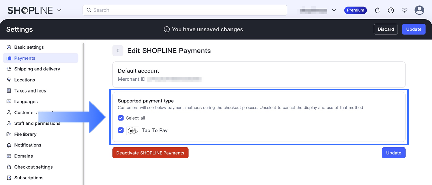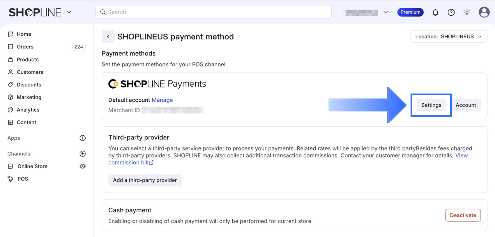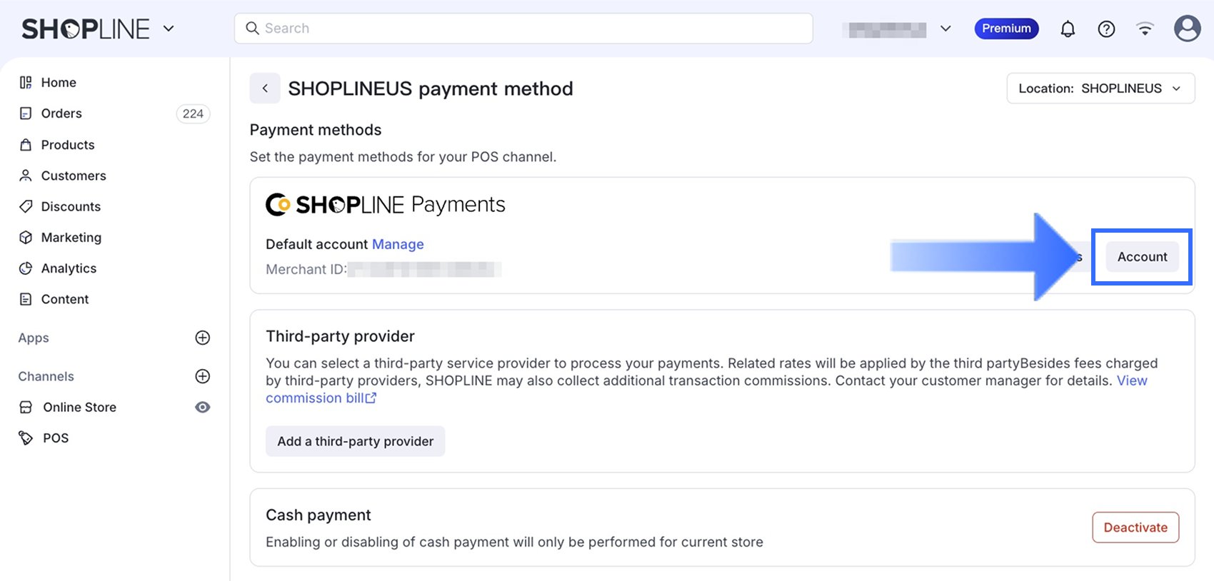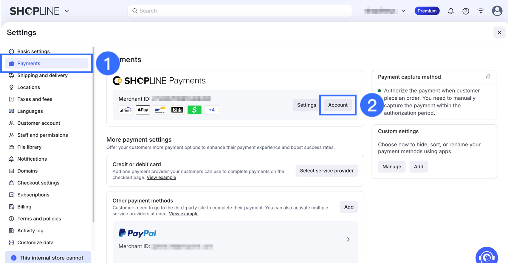 SHOPLINE管理画面から、設定 > 決済に移動します。SHOPLINEペイメントの下で、アカウントをクリックして決済アカウントセンターにアクセスします。