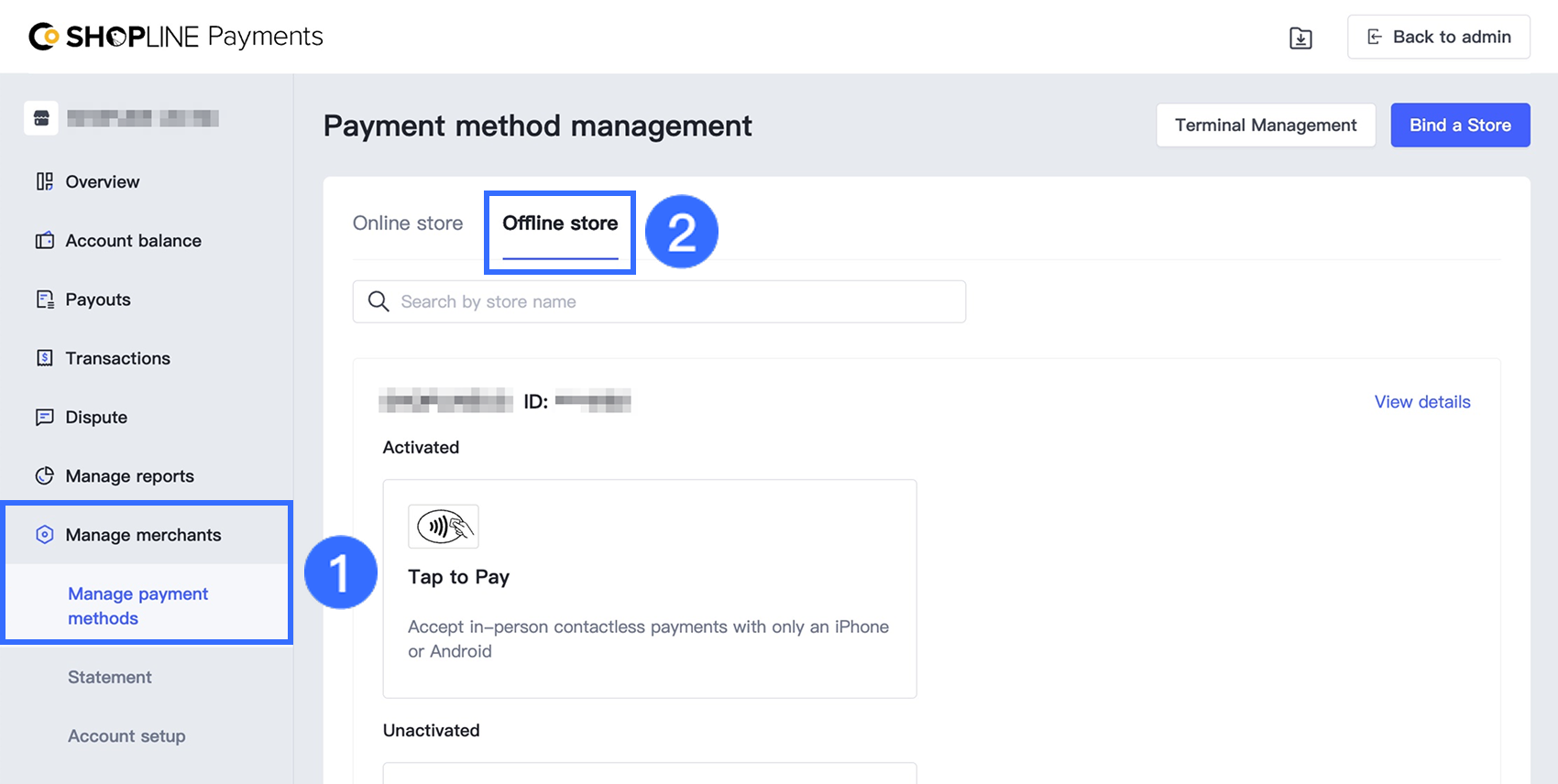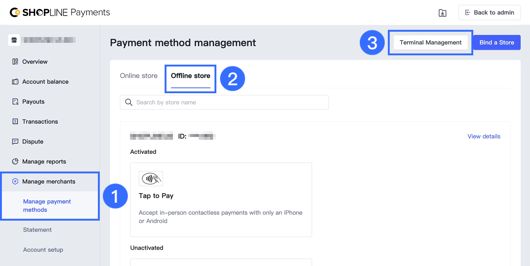 ペイメントアカウントセンターで、支払い方法の管理 > オフラインストア に移動し、次に 端末管理 をクリックします。
