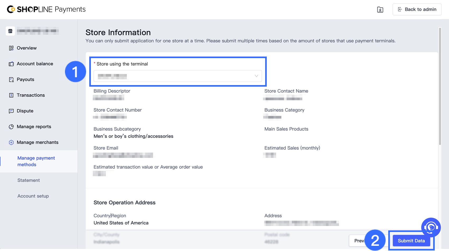 ストア情報 ページで、ストアを選択し、必要な情報を確認または入力してから、データを送信 をクリックします。