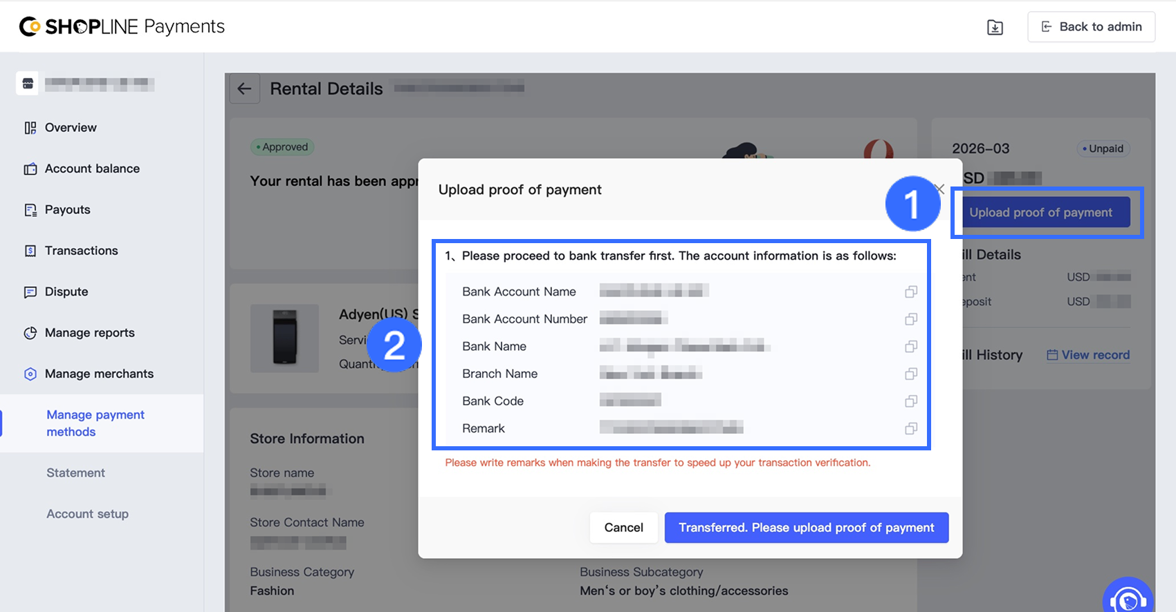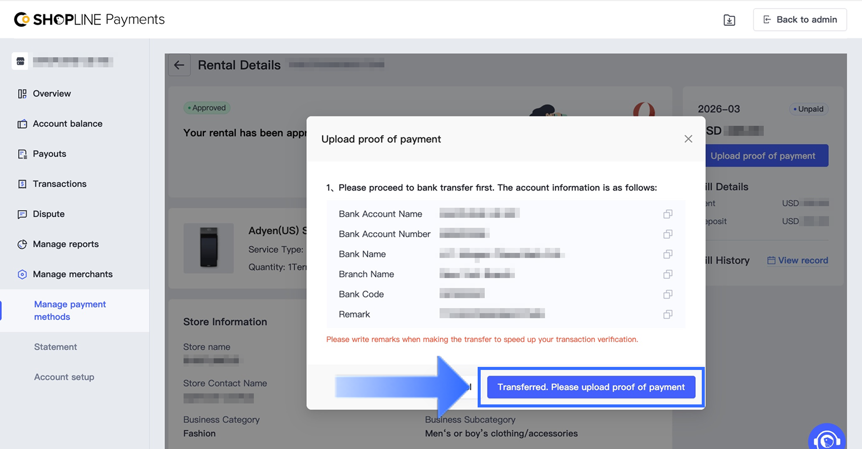支払い証明をアップロードをクリックします。ポップアップウィンドウで、提供されたアカウント情報を使って銀行振込を完了するための指示に従います。