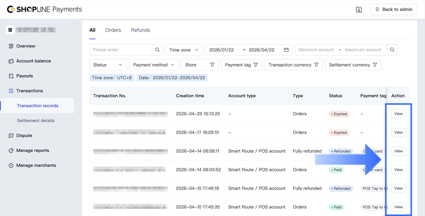 SHOPLINEペイメント管理画面で、すべてのPOS取引履歴を確認できます: