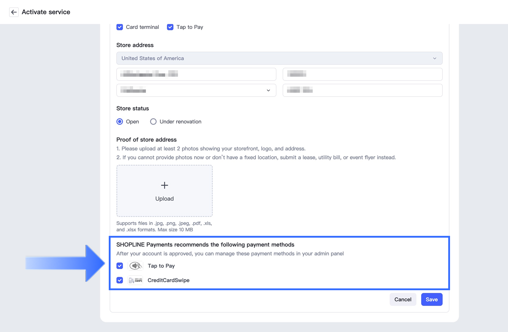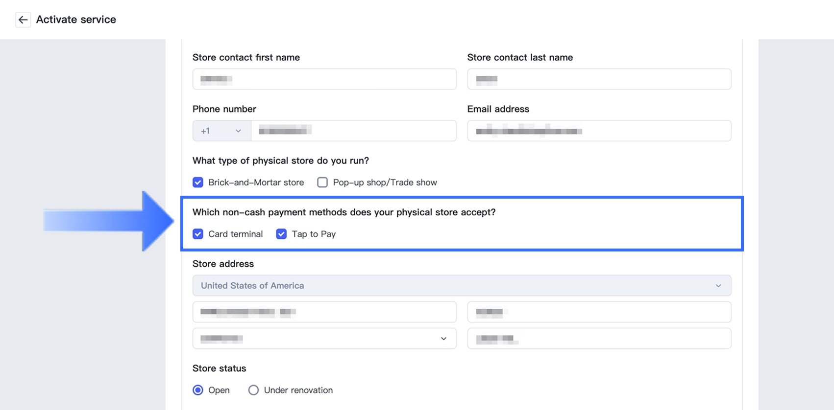 実店舗で受け付ける非現金支払い方法は何ですか?の項目で、希望する非現金支払いオプションとしてカード端末および/またはタップで支払いを選択してください。