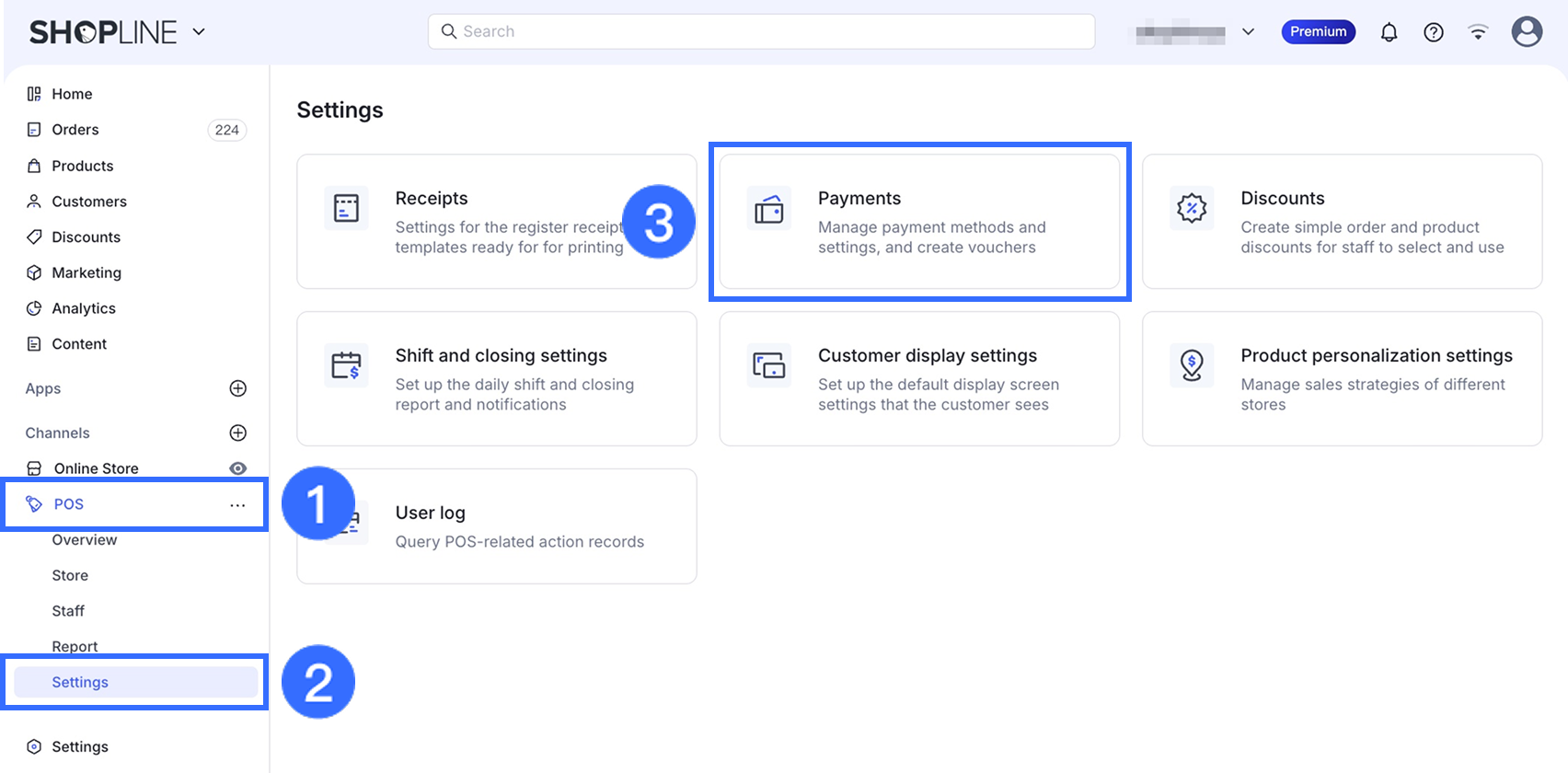 - SHOPLINE管理画面から、POS > 設定 > 支払いに移動します。
