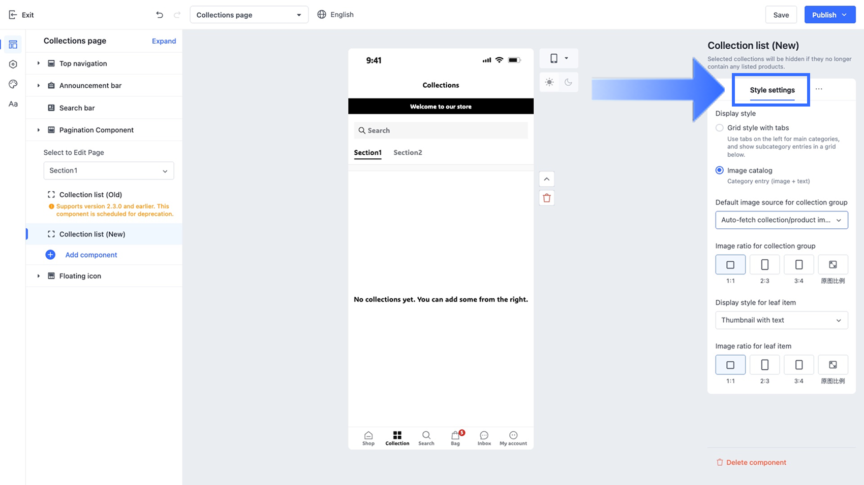 - デザインしたいページを選択し、必要に応じて該当するカテゴリページの設定を行います。右側のプレビューパネルは動的にタブを切り替え、適用された効果をリアルタイムで表示します。