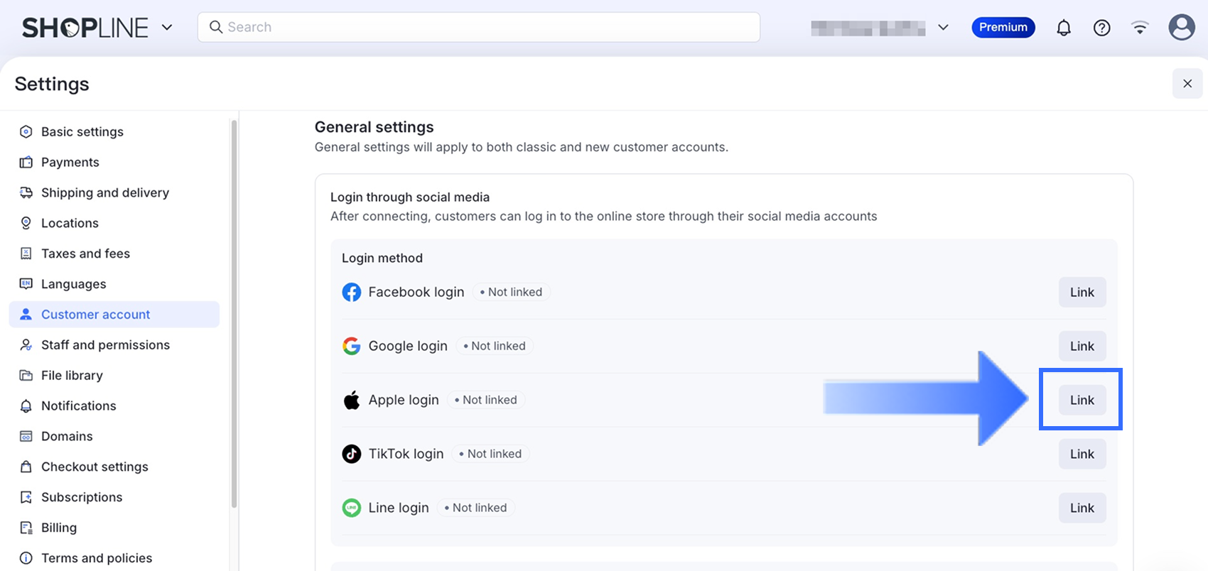 - SHOPLINE管理画面で、設定 > 顧客アカウント > 一般設定に移動します。