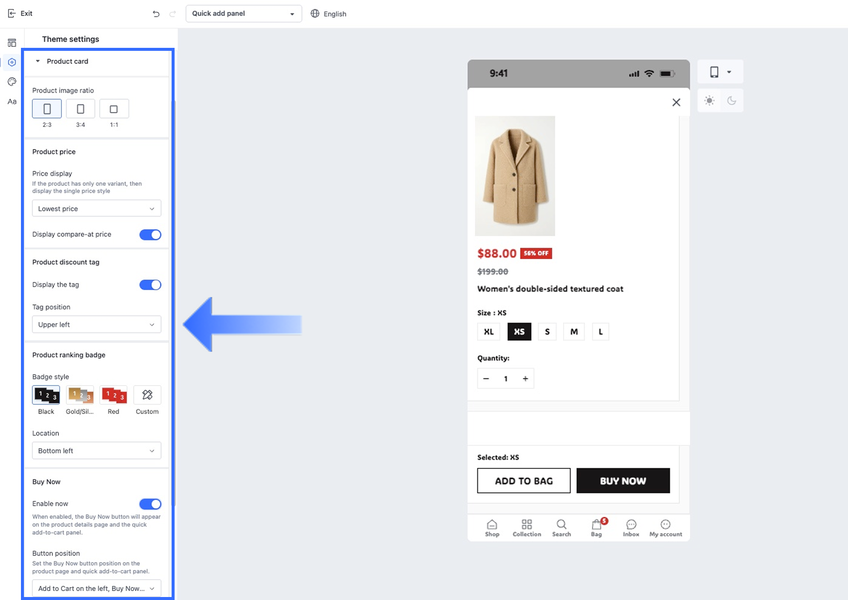 今すぐ購入機能を有効または無効にして、顧客が商品詳細ページおよびクイックカート追加パネルから直接購入できるようにし、ボタンの順序を設定します: