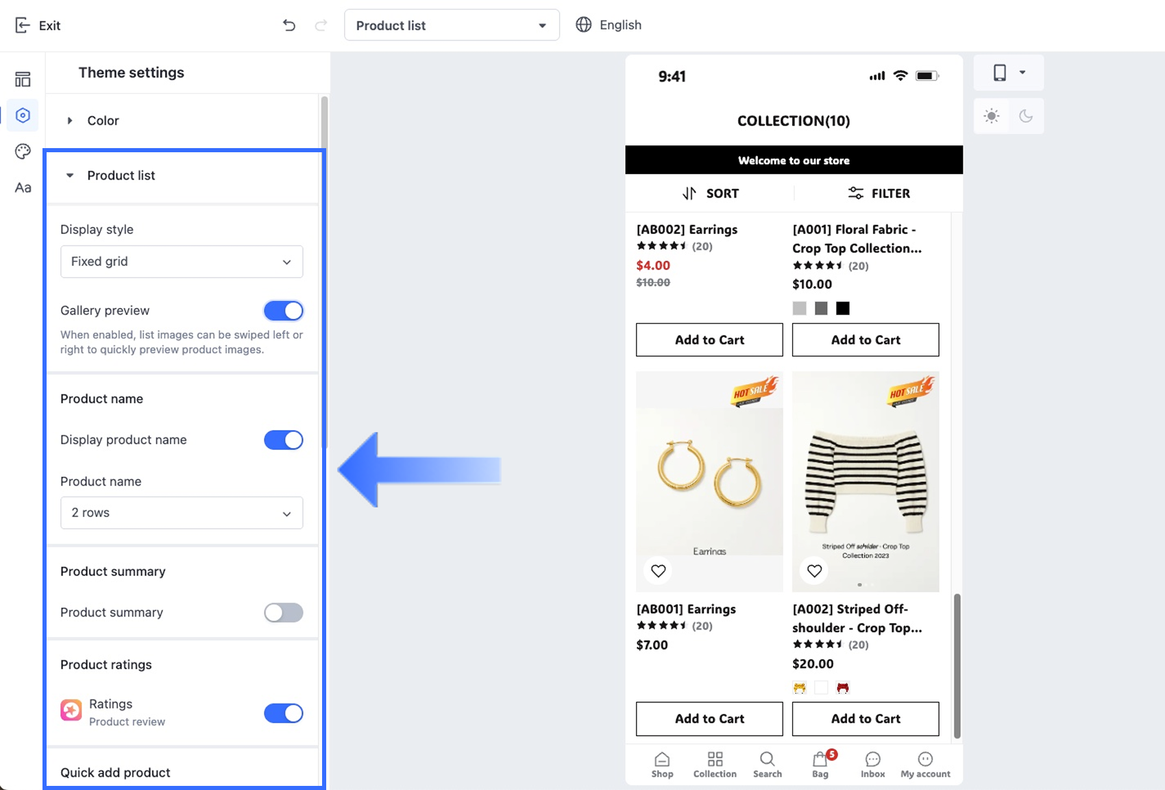 商品リストセクションをクリックして、アプリ全体の商品の表示設定を構成します。これらの設定は、アプリのトップページのカテゴリおよび商品パーツ、検索結果、商品レコメンド、カートレコメンド、お気に入り登録ページに適用されます。以下の設定をカスタマイズできます: