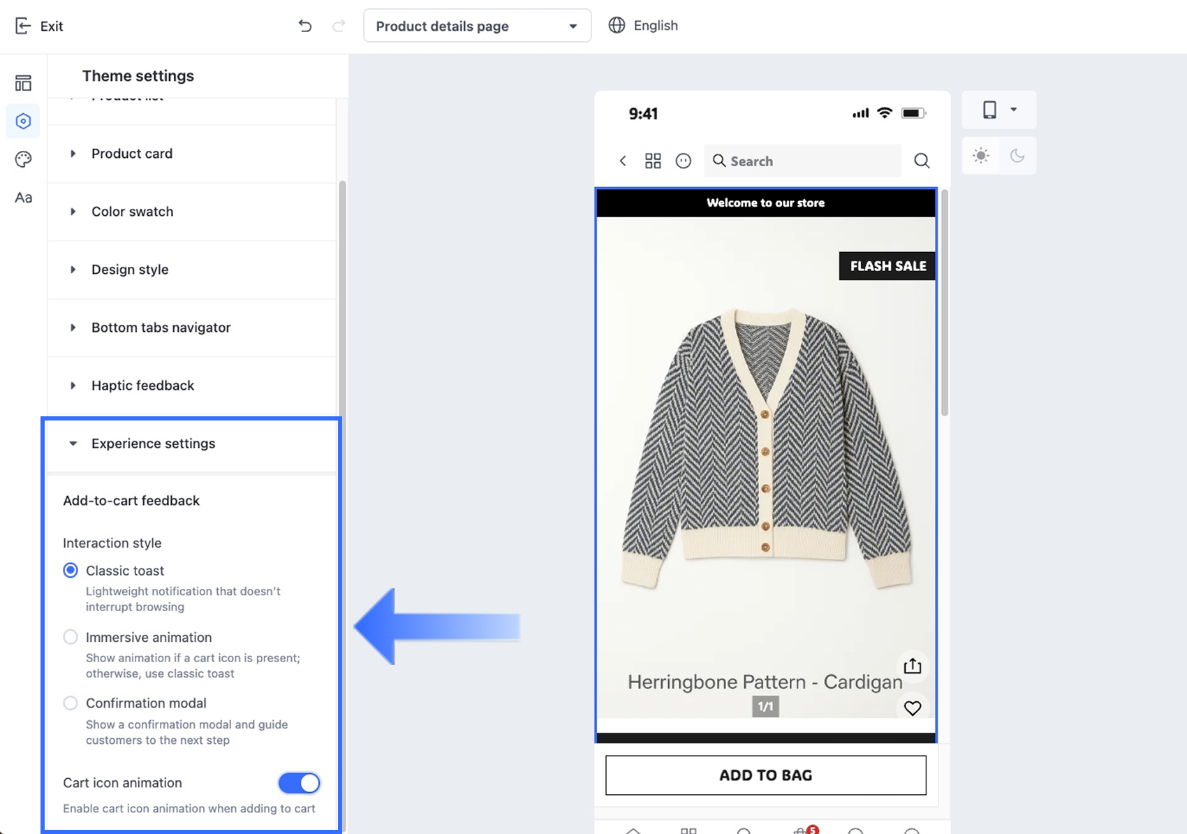 エクスペリエンス設定セクションでは、商品詳細ページでのインタラクション動作を設定できます。これには、カート追加時のフィードバックの表示方法やカートアイコンのアニメーションの有効化が含まれます。これらの設定は全体的なユーザー体験の最適化に役立ちます。
