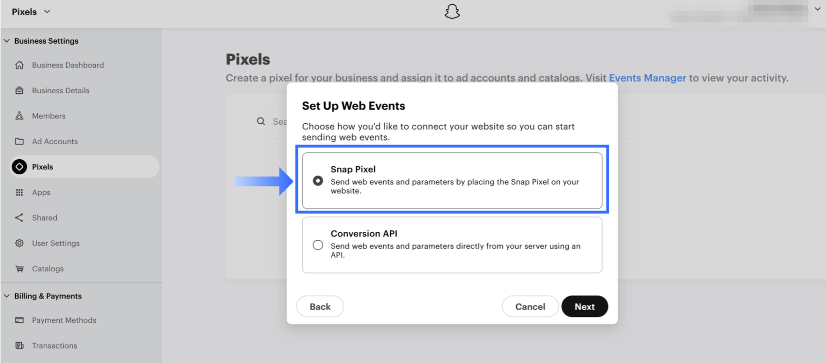 ポップアップウィンドウでSnap Pixelを選択し、Nextをクリックします。