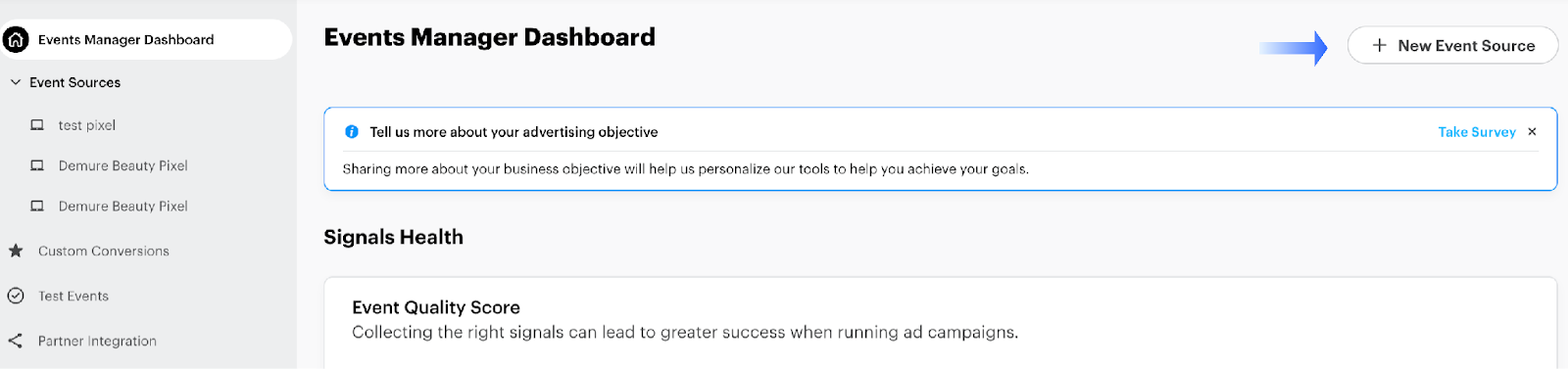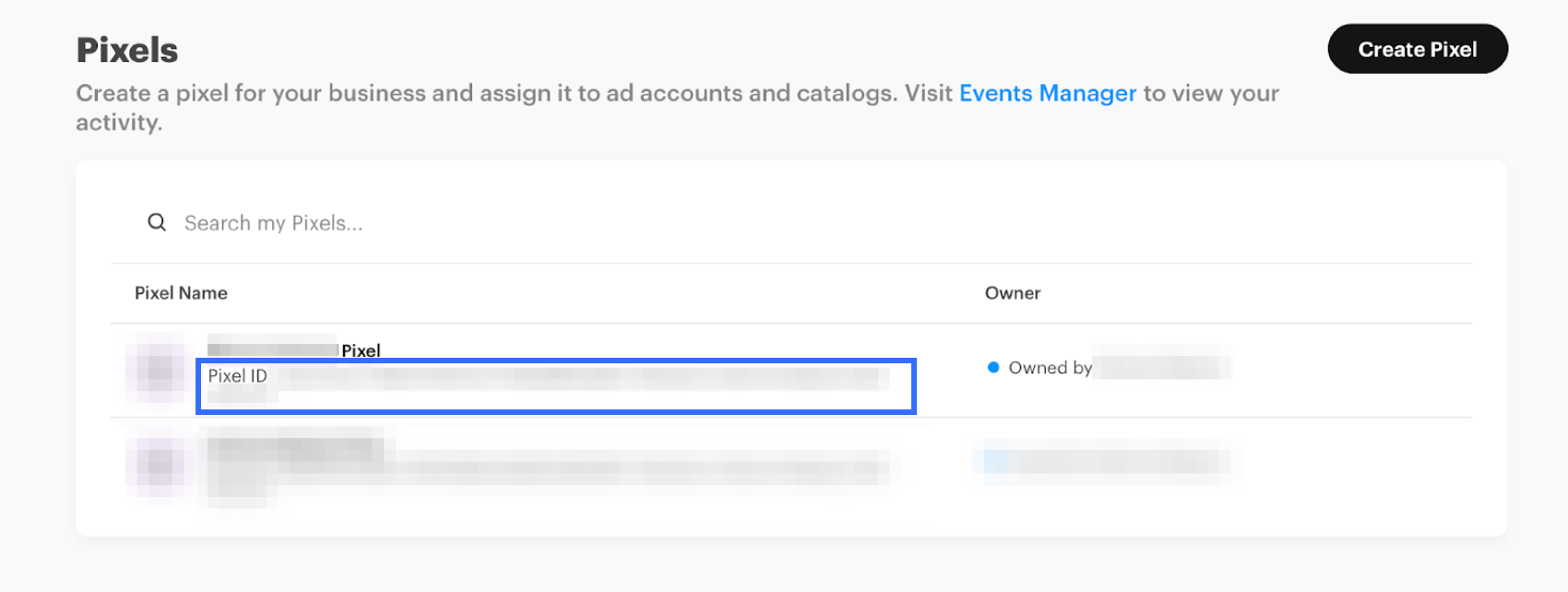 Business Settings > Pixelsに戻ると、pixel IDが作成されているのが確認でき、特定のPixel名をクリックして、このPixelを追跡したい広告アカウントに接続できます。