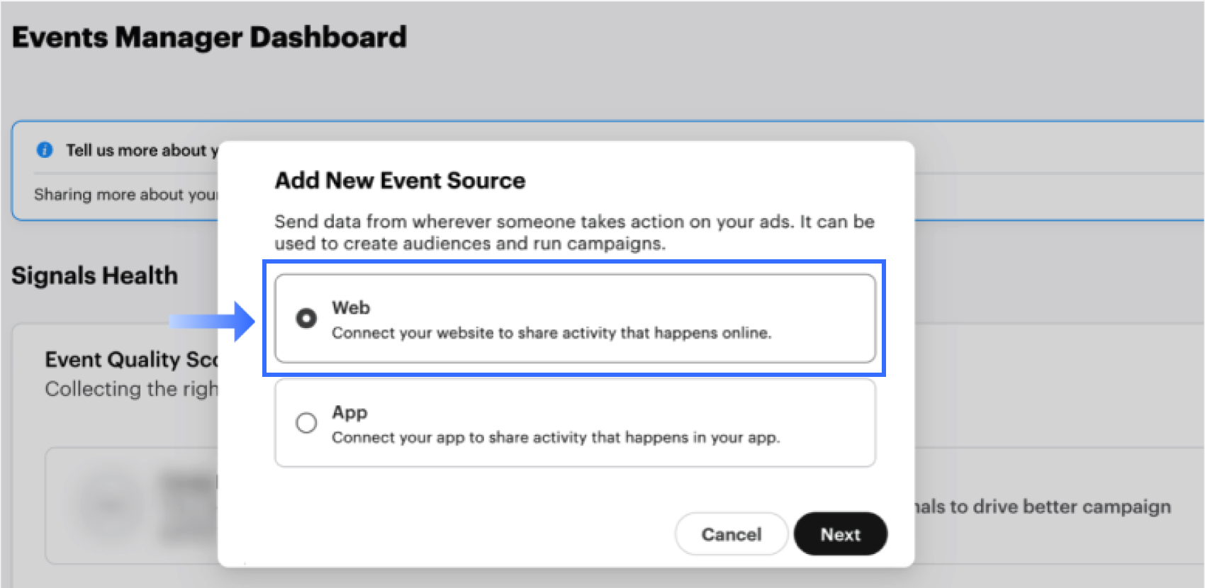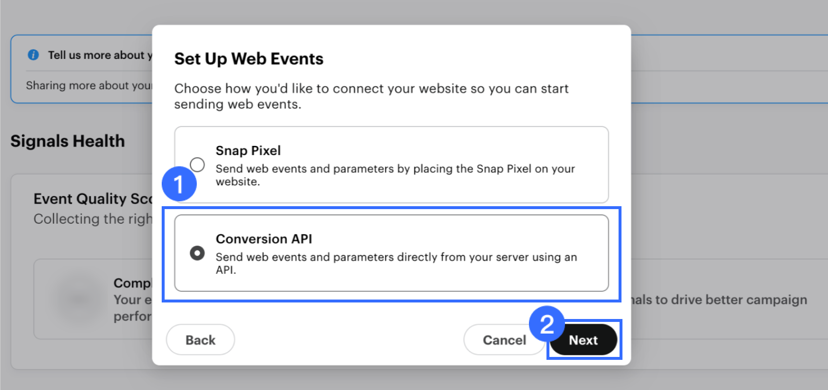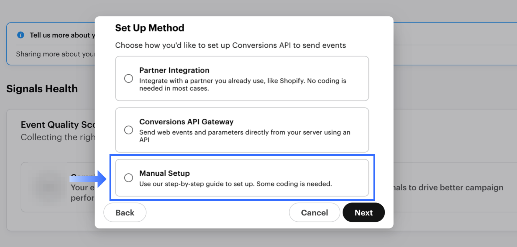 セットアップ方法を選択して、コンバージョンAPIがイベントを送信する方法を選びます。より細かい制御と柔軟性のために、手動セットアップを推奨します。その後、次へをクリックします。