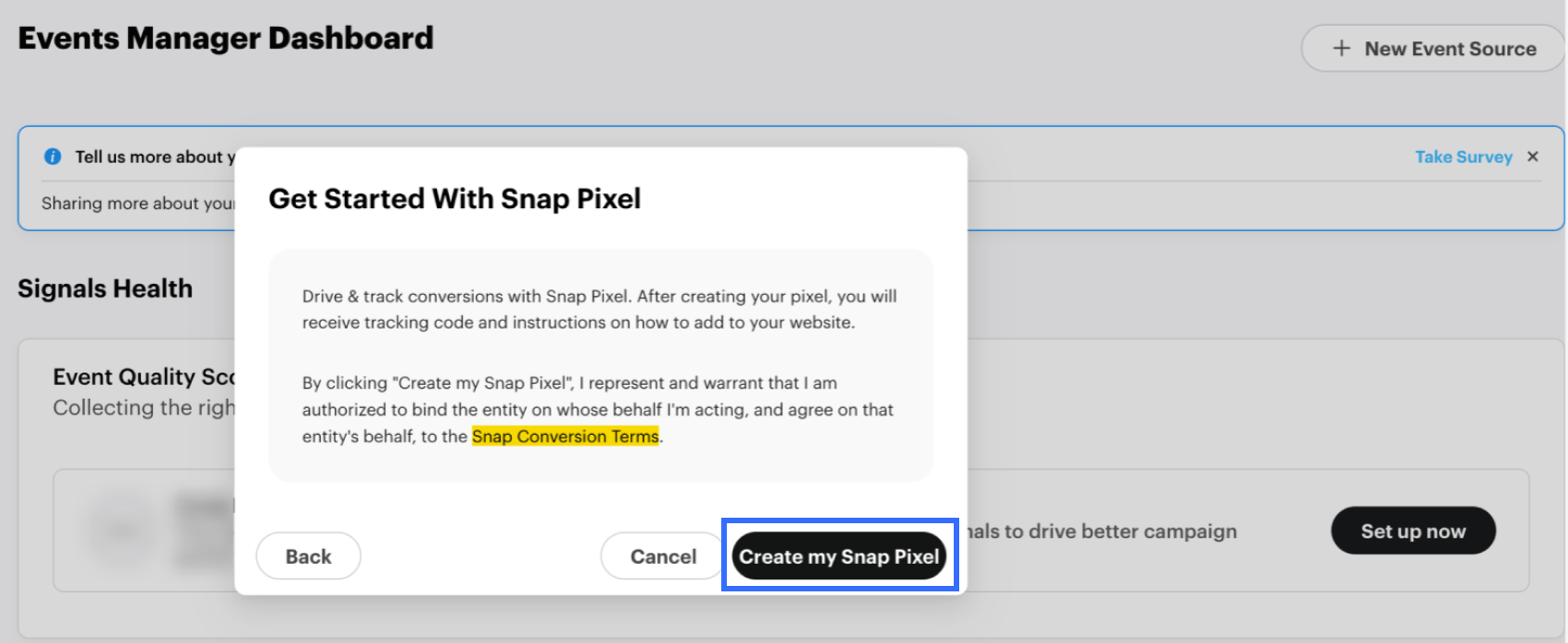 まだ作成していない場合は、Snap Pixelを作成をクリックします。