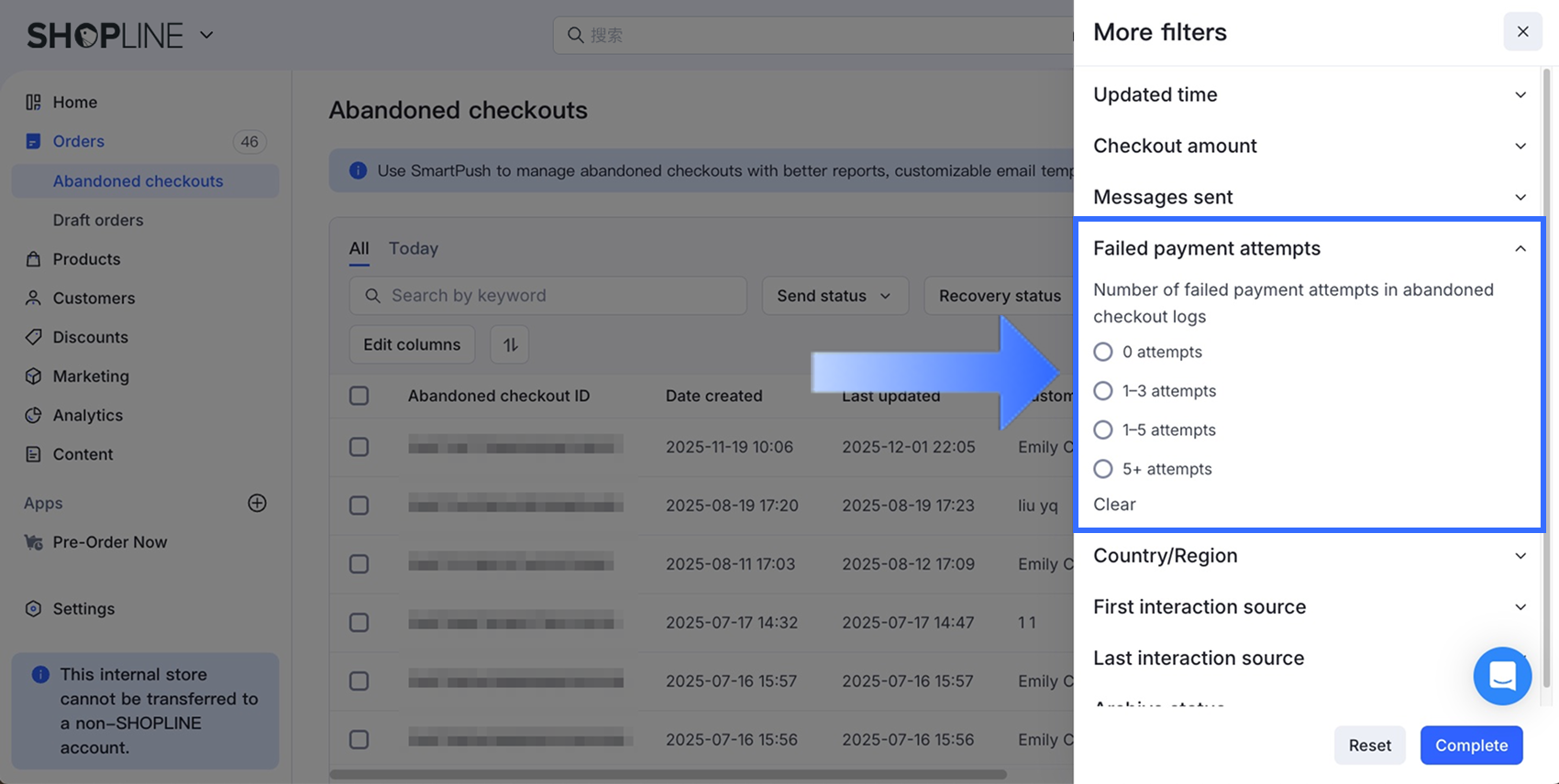 マーチャントが顧客がカート離脱前に何回支払いを試みたかを評価できるように、SHOPLINEは支払い失敗回数でのフィルターをサポートしています。このフィルターを適用するには、その他のフィルター > 支払い失敗回数に移動してください。以下のオプションが表示されます:
