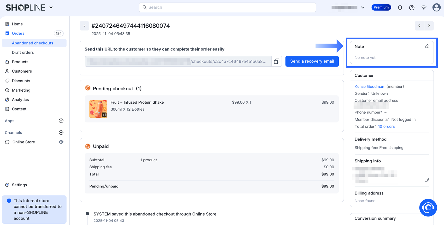 カート離脱は、注文モジュールの中のセクションで、SHOPLINEは顧客の連絡先情報、選択した商品、マーケティングの設定、配送先住所、配送方法、支払い情報などを含むカート離脱情報を収集します。これらのデータは顧客がチェックアウト時に提供したものです。これらのカート離脱を分析し、購入完了のリンクを含むリカバリーメールを送信するなどの対応を取ることができます。