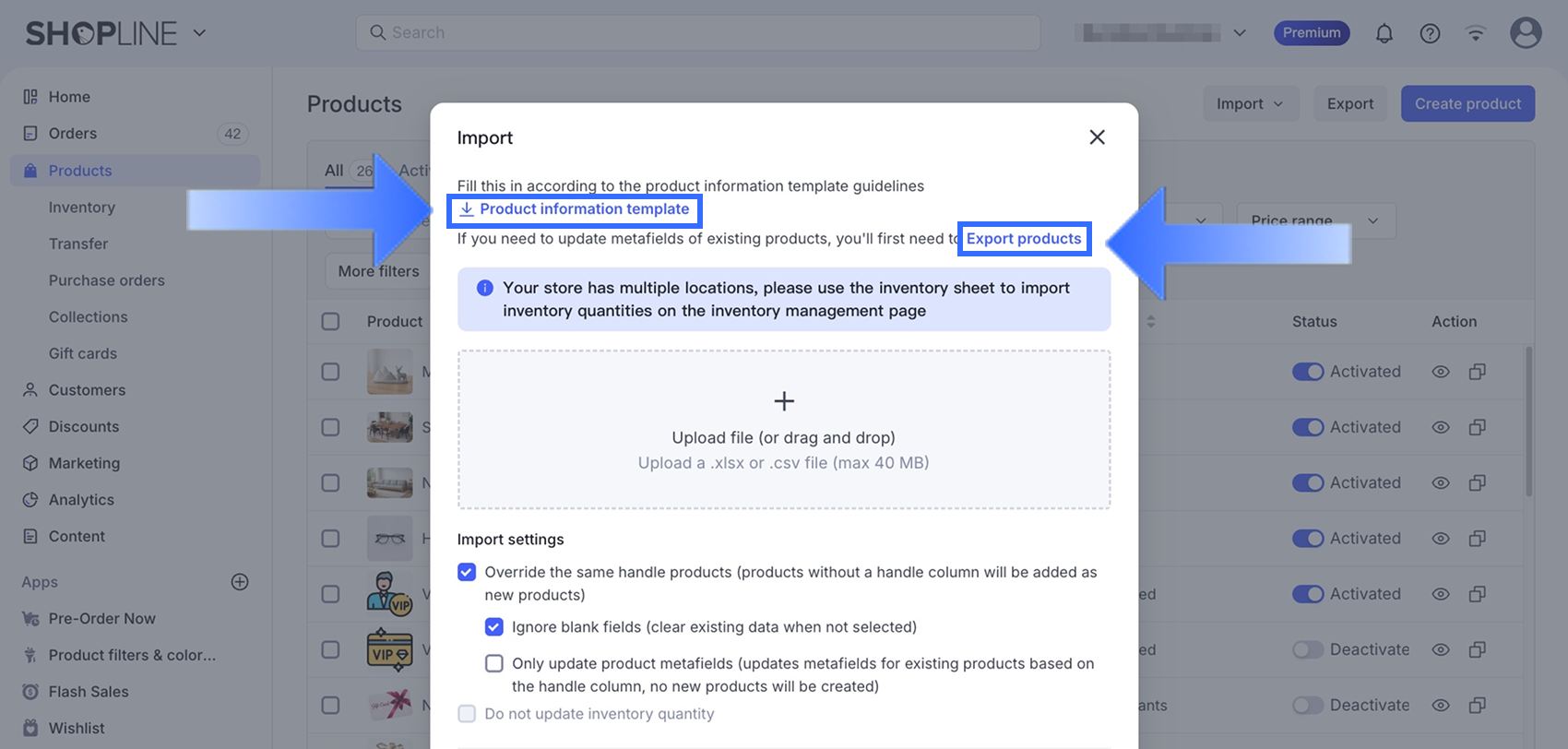 商品テンプレートの作成が完了したら、SHOPLINE管理画面にアップロードして、一括で商品を作成または更新できます。