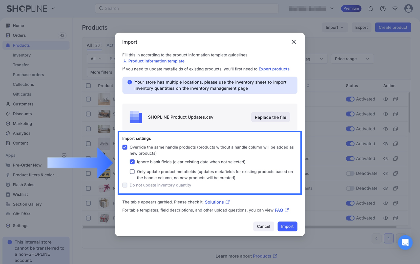 - CSVファイルで値を上書きして更新を実行すると、SHOPLINEは同じハンドルを持つ既存の商品を置き換えます。既存の値はCSVファイルの値で上書きされます。例えば、既存商品のブランド値が「Apple」であっても、インポートしたCSVファイルのその商品のブランド列が空欄の場合、ブランド情報は空白の値で上書きされます。