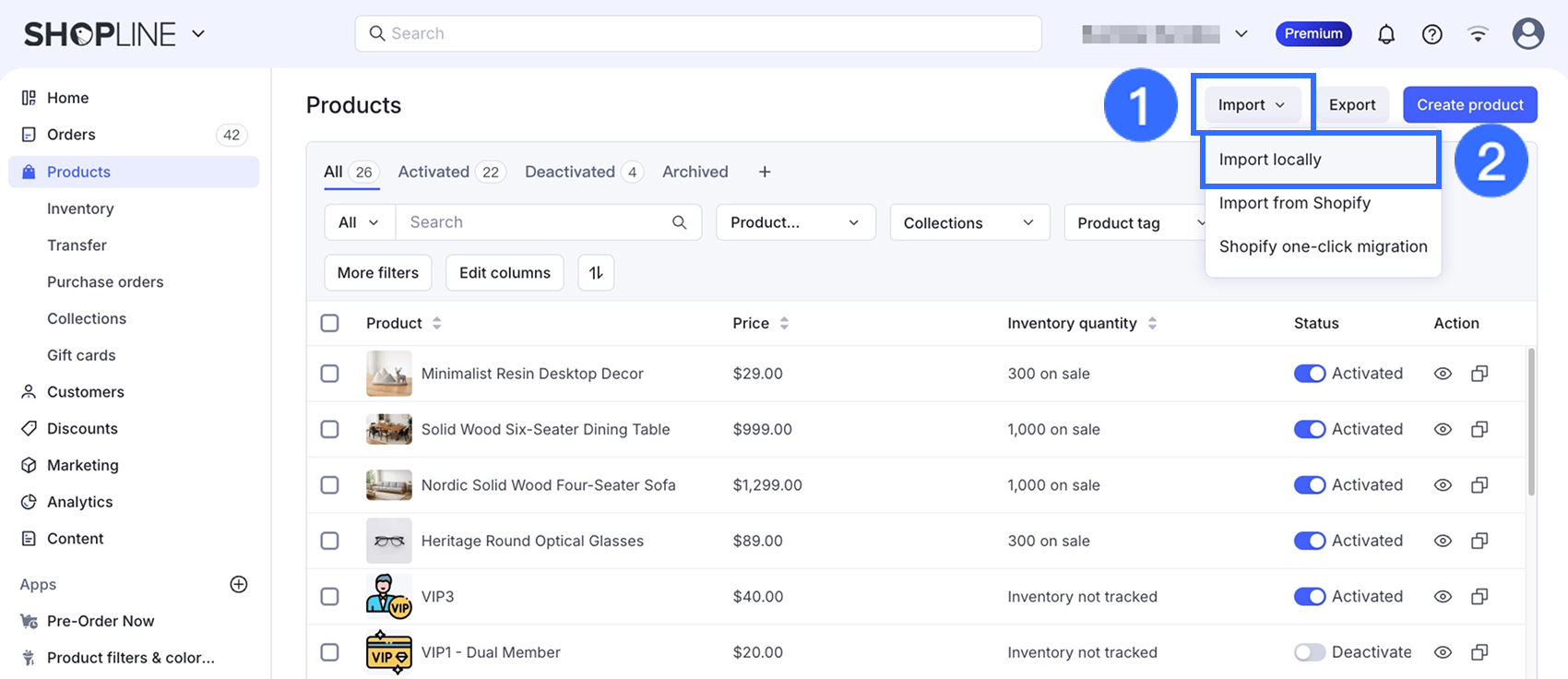 SHOPLINE管理画面から、商品に移動します。右上のインポートをクリックし、次にローカルからインポートを選択します。