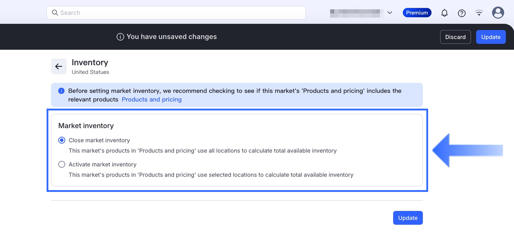 - マーケット在庫を有効化:このマーケットの在庫は選択したロケーションのみの在庫を使用して計算されます。マーケットごとにフルフィルメントを管理したり在庫を制御したりするのに理想的です。