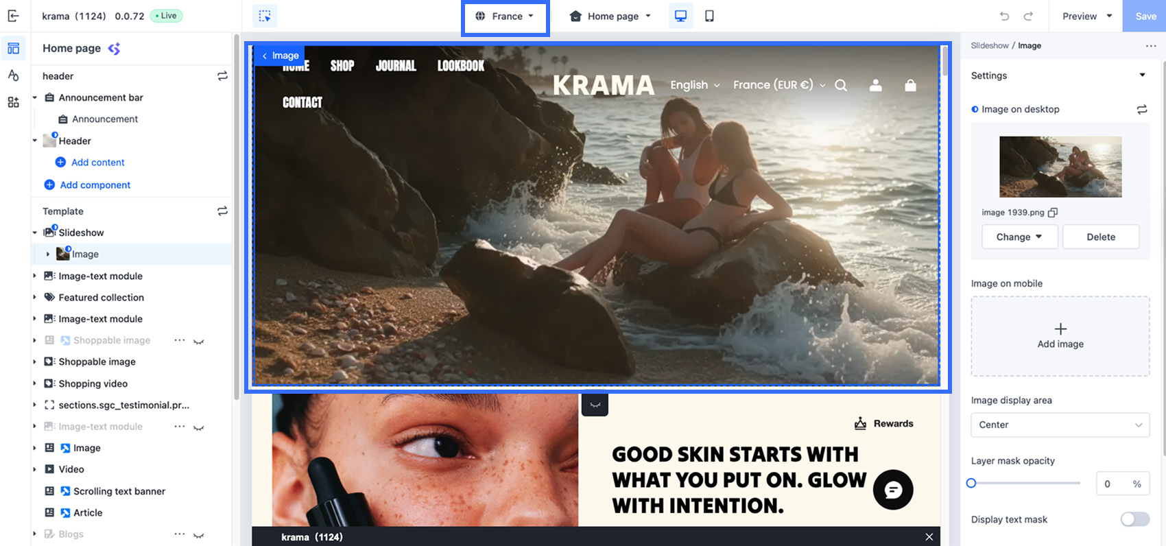 特定のマーケット向けにセクション内のブロックやセクション全体を追加または削除できます。ブロックやセクションはドラッグ&ドロップで並べ替えも可能です。