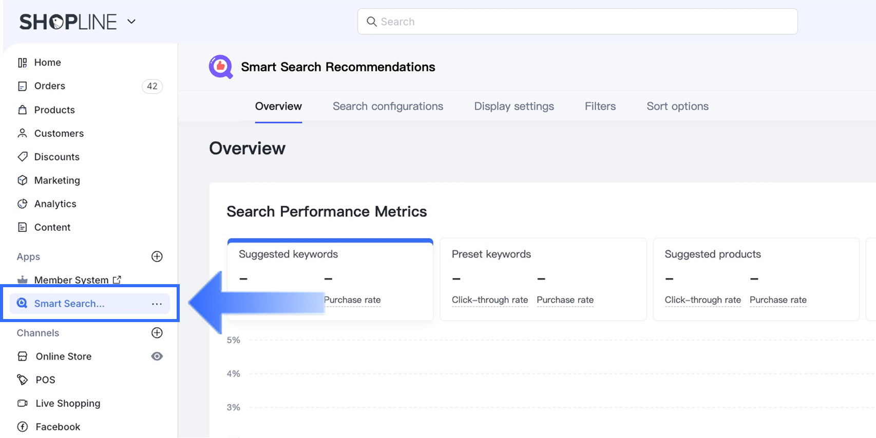 SHOPLINE管理画面から、アプリ > スマート検索に移動します。