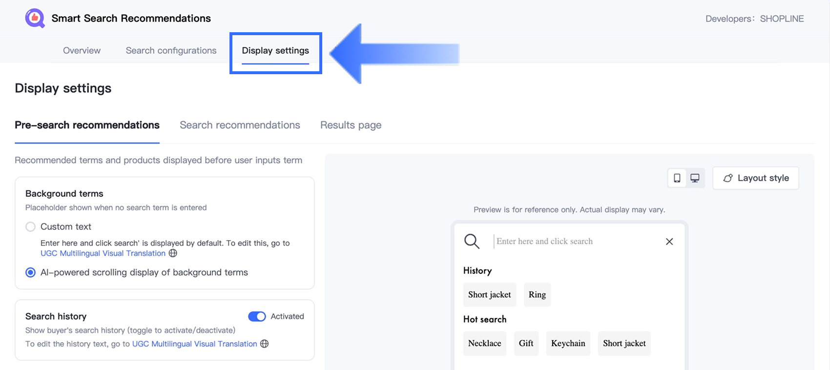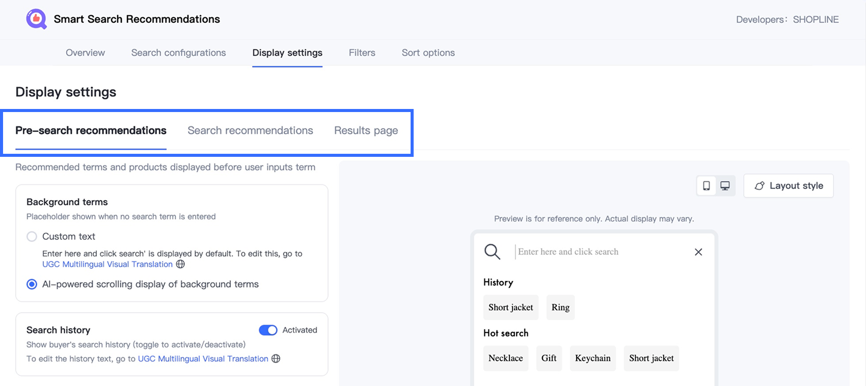 スマート検索アプリの表示設定では、顧客の検索の各段階—検索前、検索中、検索後—における商品レコメンドの表示方法を制御できます。レコメンドの表示をカスタマイズすることで、全体的なショッピング体験を向上させ、直帰率を減らし、コンバージョンを促進できます。