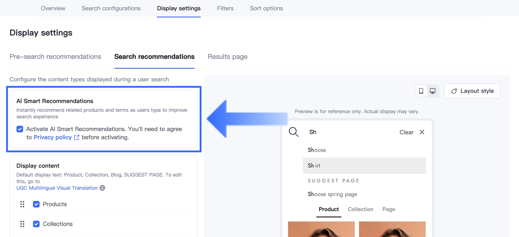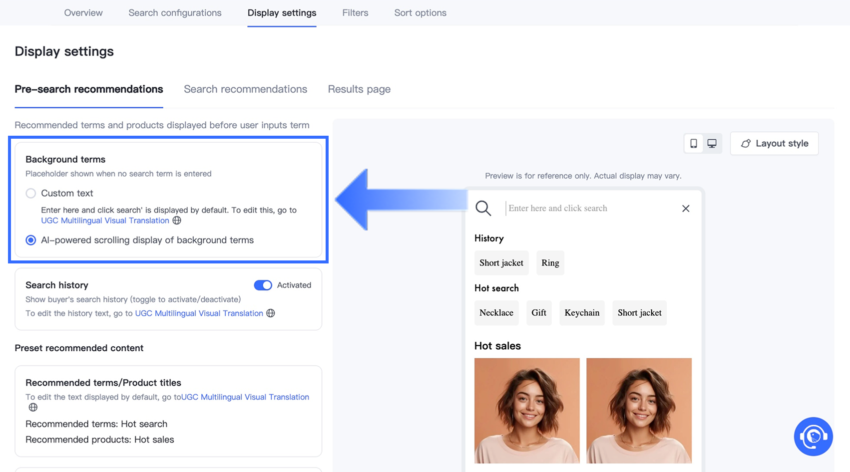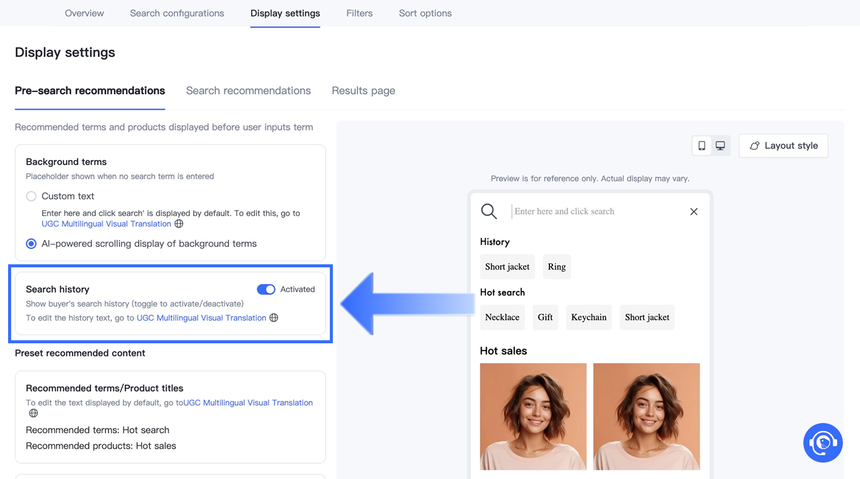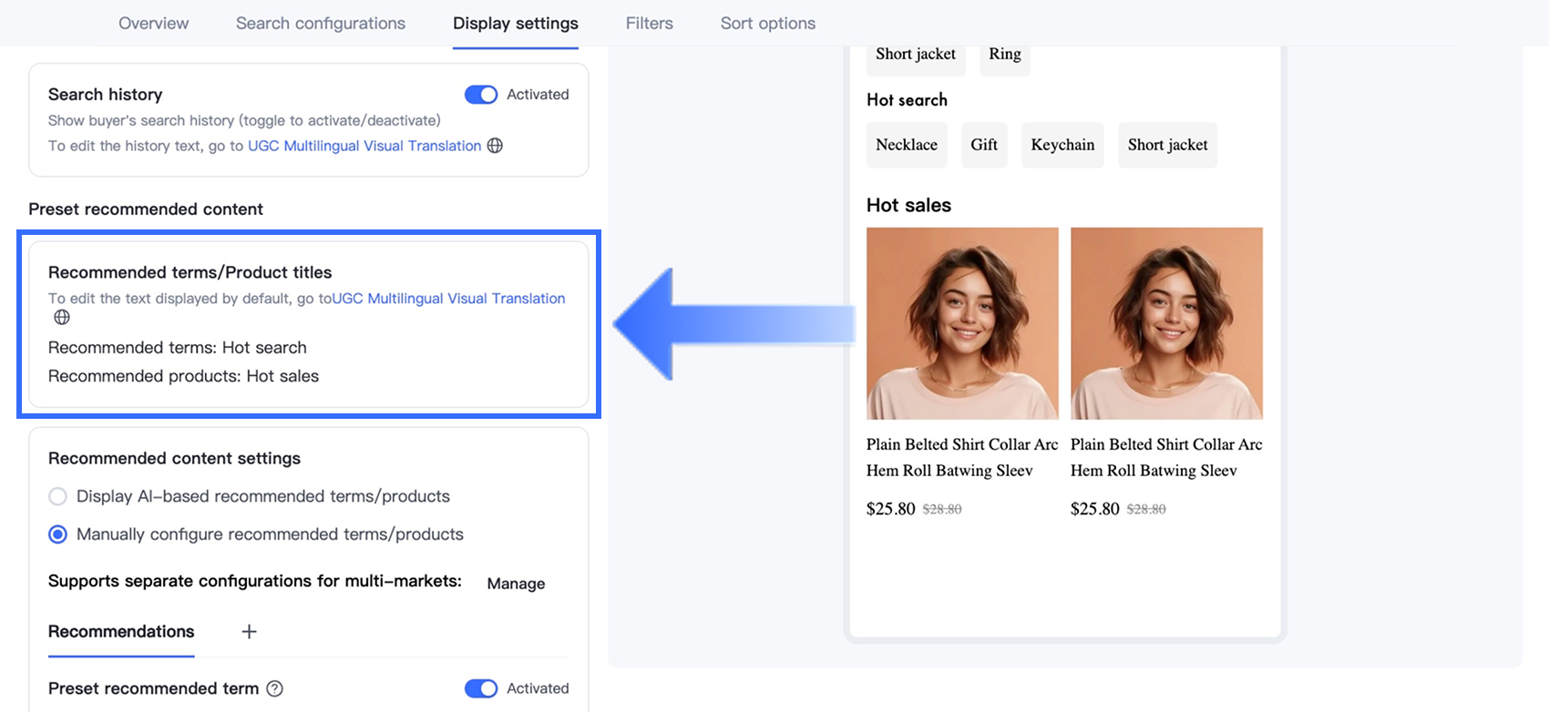 推奨コンテンツ設定:検索前にキーワードと商品がどのように表示されるかを選択します:
