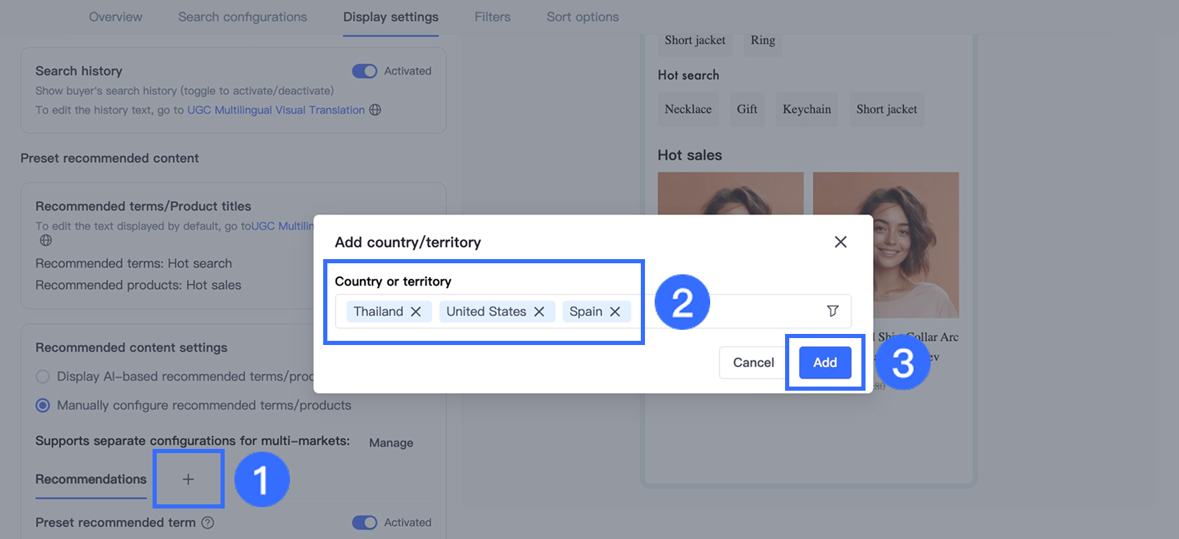 マーケットを追加するには:推奨の横にある+アイコンをクリックし、国または地域を選択して追加をクリックします。その後、マーケットごとの用語や商品を設定できます。