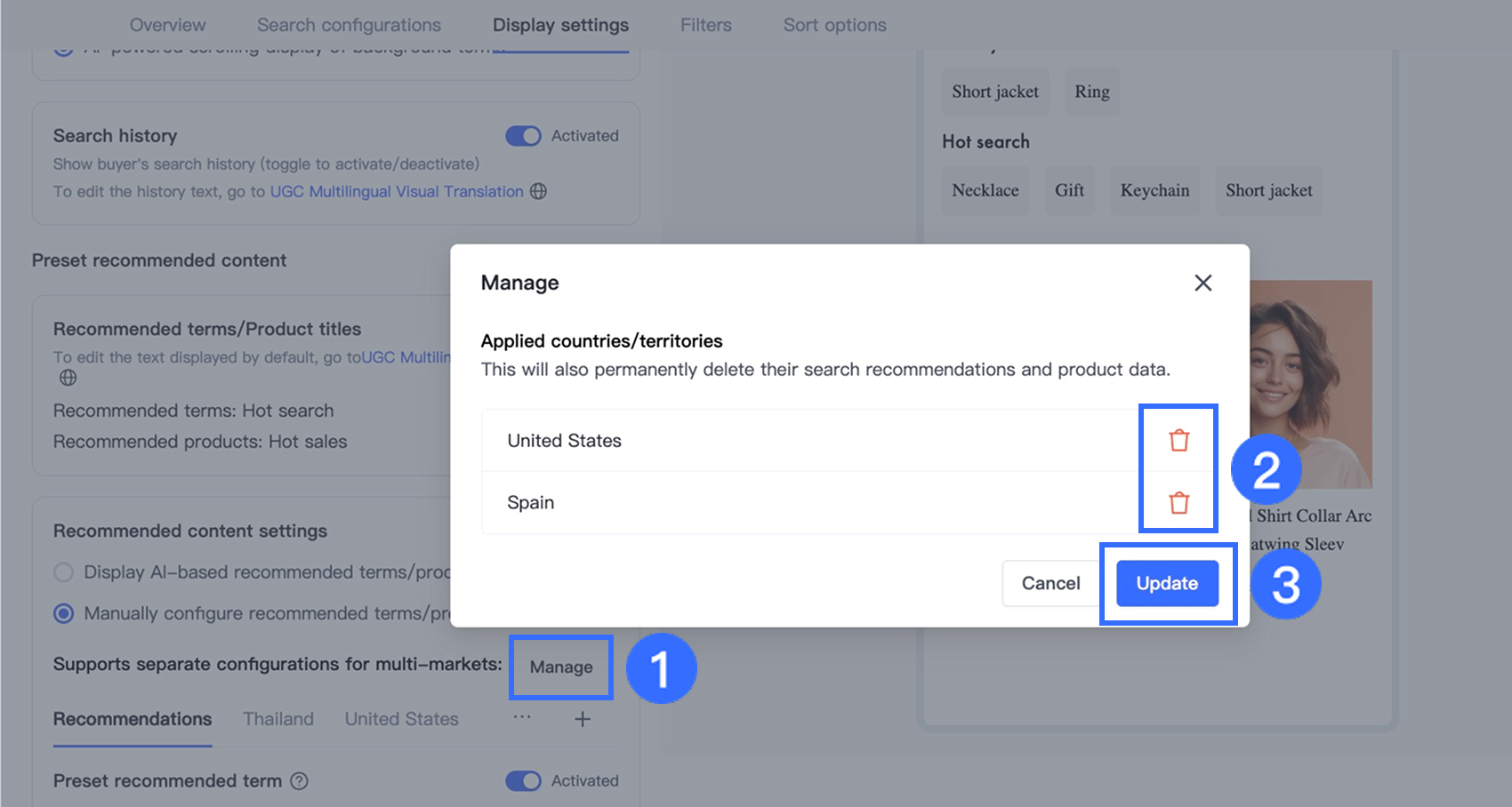マーケットを削除するには:マルチマーケット別設定をサポートの横にある管理をクリックします。ポップアップで、ゴミ箱アイコンをクリックして地域を削除します。