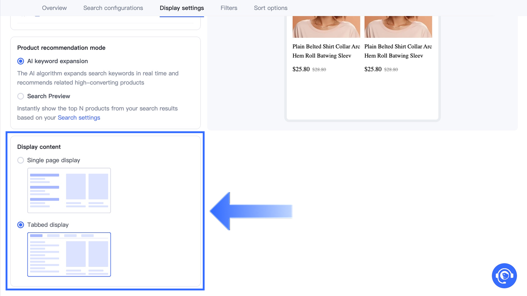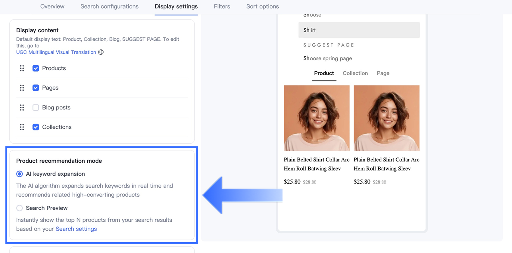 前のステップで商品がコンテンツタイプとして選択されている場合、検索ドロップダウンに表示されるレコメンド商品の生成方法と表示方法を選択できます。システムは2つのモードを提供します: