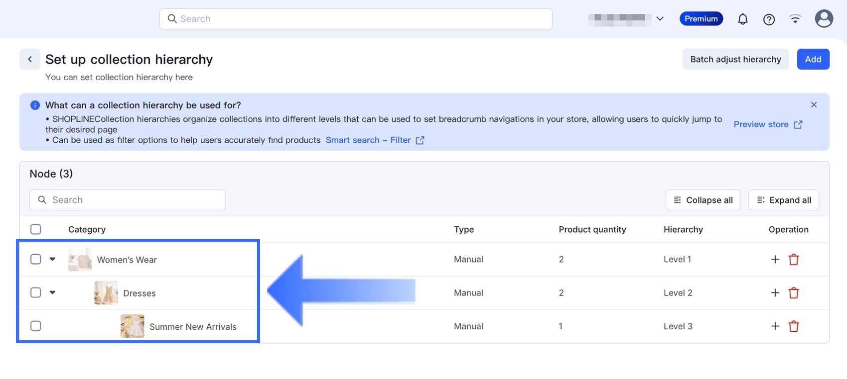 | 注: カテゴリツリー機能は現在早期アクセス段階にあります。アクセスを申請するには、SHOPLINEカスタマーサポートにお問い合わせください。 |