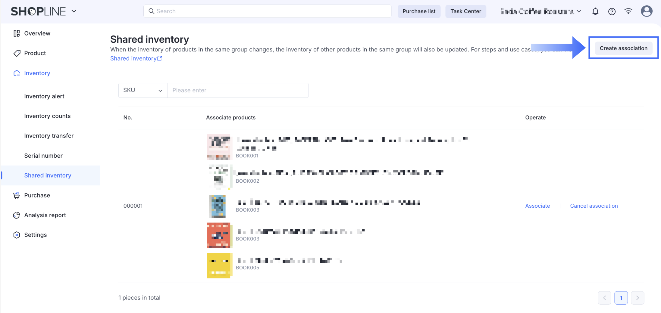 スマート在庫管理アプリから、在庫 > 共有在庫に移動し、関連するグループを見つけます。関連付けを削除したいSKUの横にある関連付けをキャンセルをクリックします。
