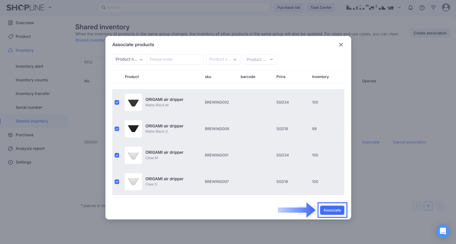 スマート在庫管理アプリから、在庫 > 共有在庫に移動し、右上隅の関連付けを作成をクリックします。