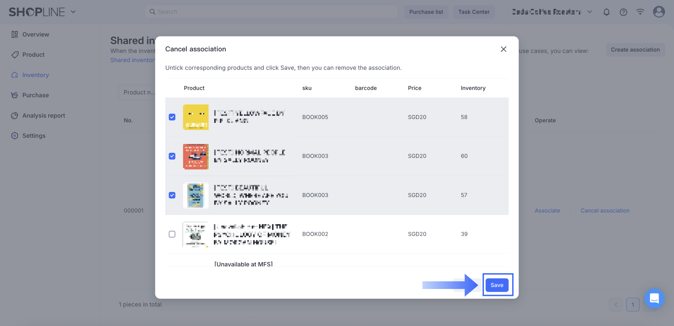 - 関連付けをキャンセルしたいSKUを選択し、保存をクリックしてプロセスを完了します。
