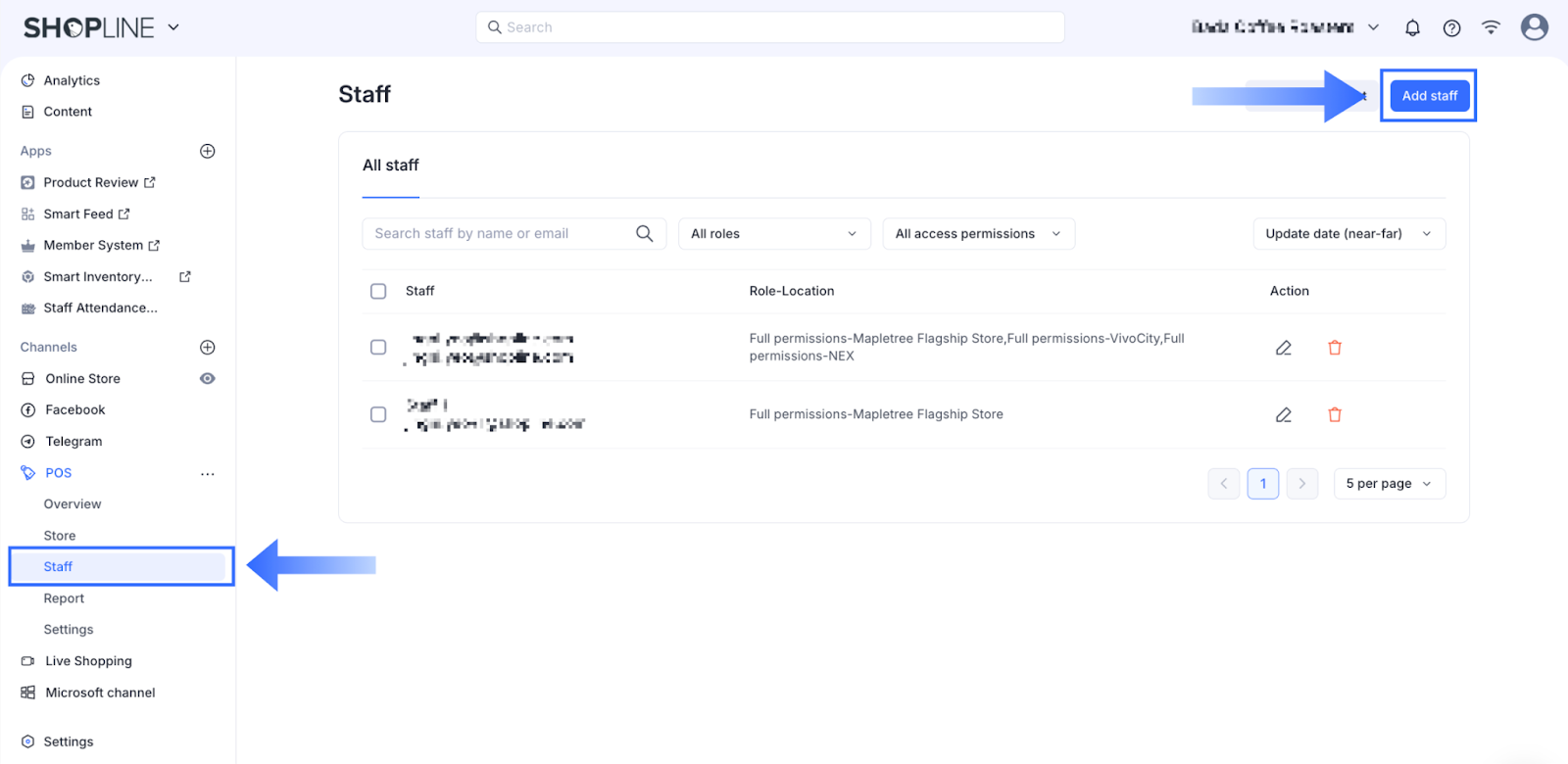 - SHOPLINE管理画面にログインし、POSに移動してスタッフをクリックします。