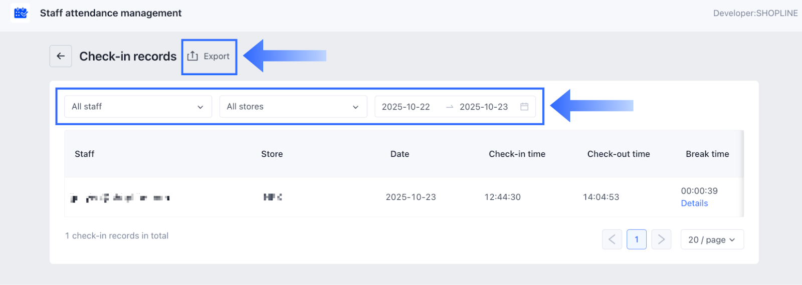 勤怠記録の表示、フィルタリング、エクスポート: チェックイン記録を表示をクリックすることで、今日の勤怠記録を確認できます。スタッフ名、ストア、または時間範囲でデータをフィルタリングして、必要な勤怠データを迅速に見つけ、エクスポートボタンをクリックしてダウンロードします。