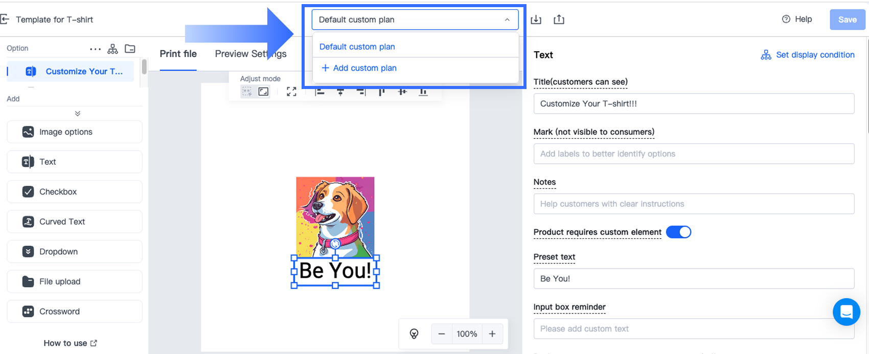 - エディターの上部で、現在のプラン名のドロップダウンをクリックし、次に + カスタムプランを追加 をクリックします。