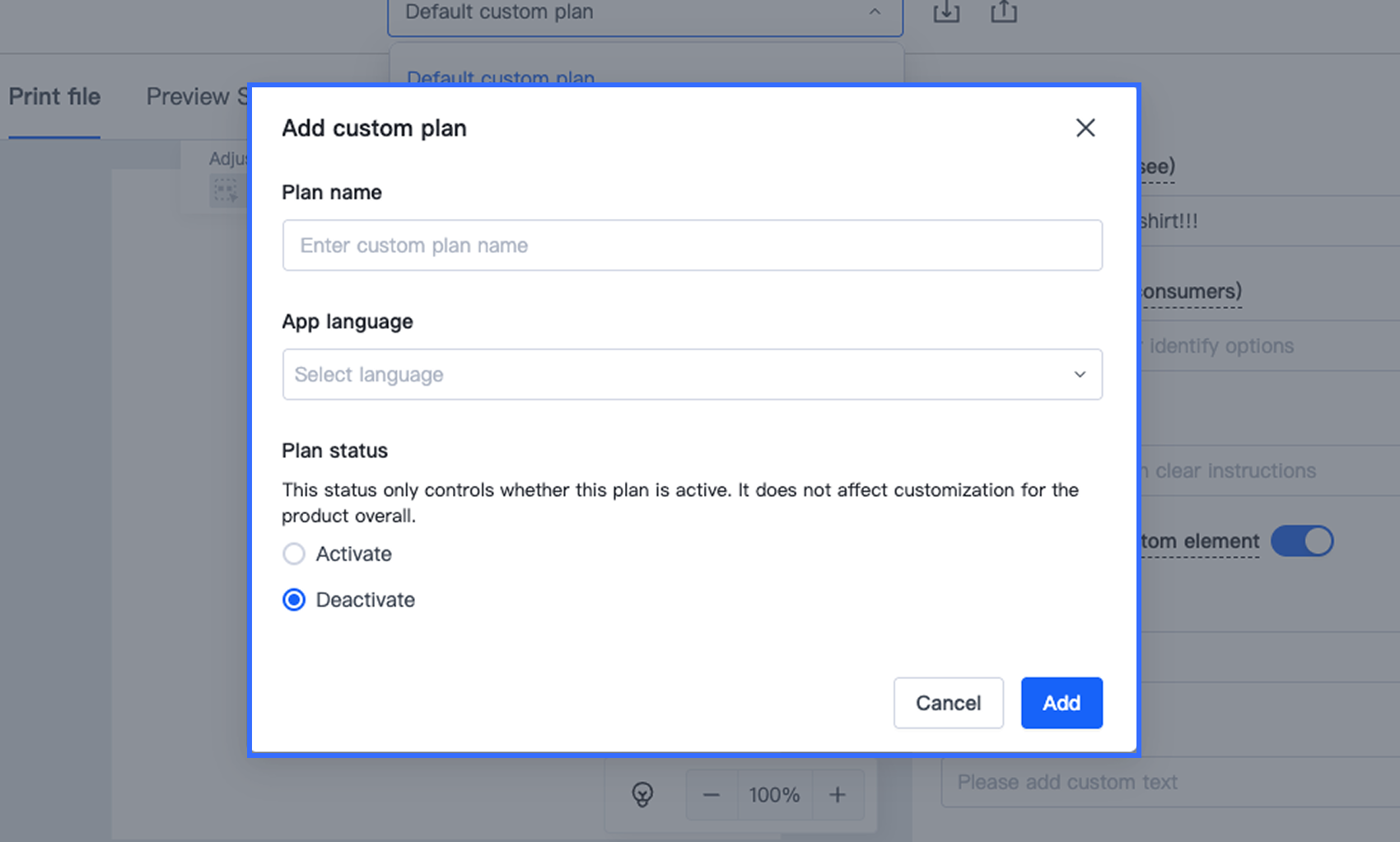 - ポップアップウィンドウで、プラン名 を入力し、このプランの アプリ言語 を選択し、必要に応じて プランステータス を設定します。次に 追加 をクリックします。
