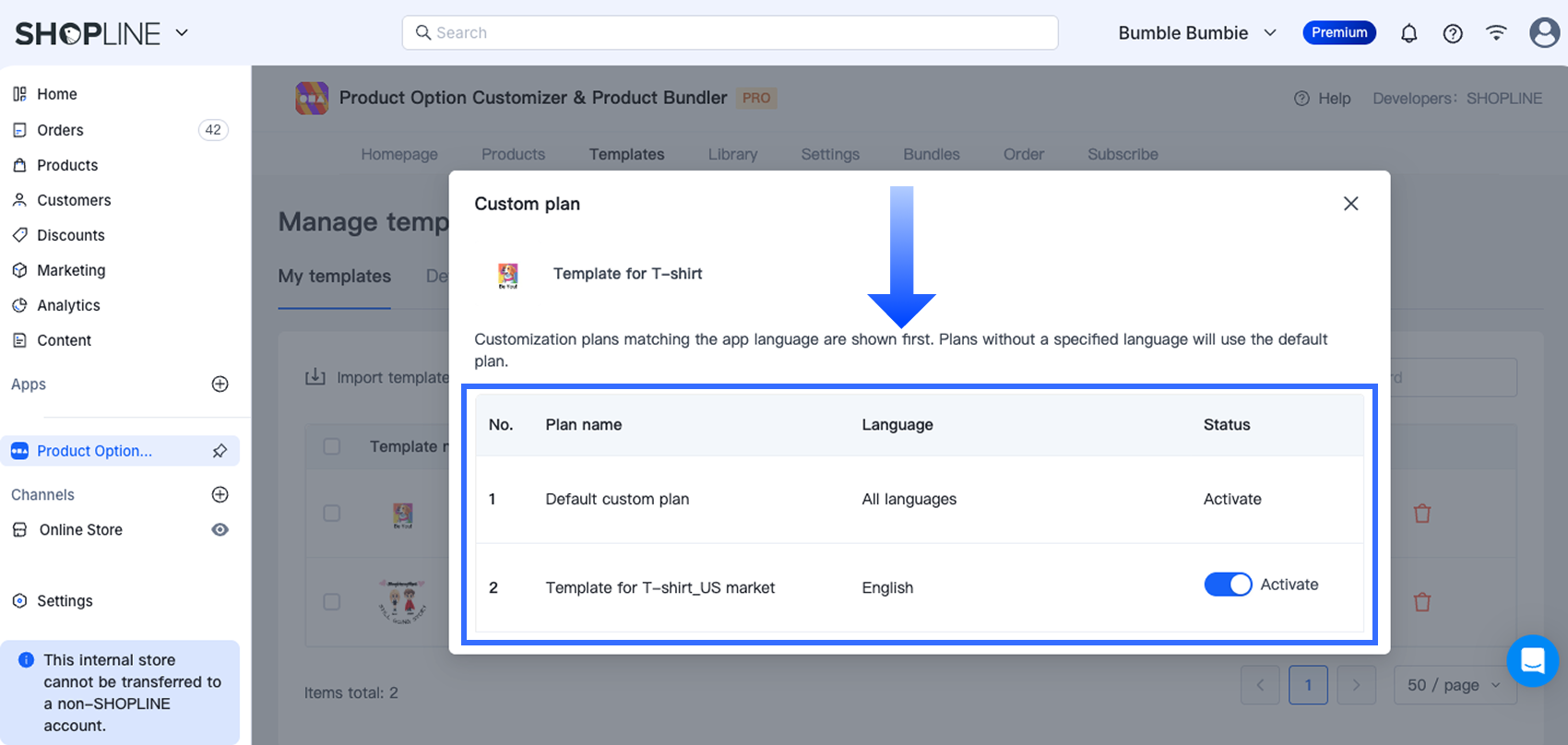 対応するプランリストをクリックすると、そのテンプレートのプラン名、割り当てられた言語、および有効化ステータスを確認できます。
