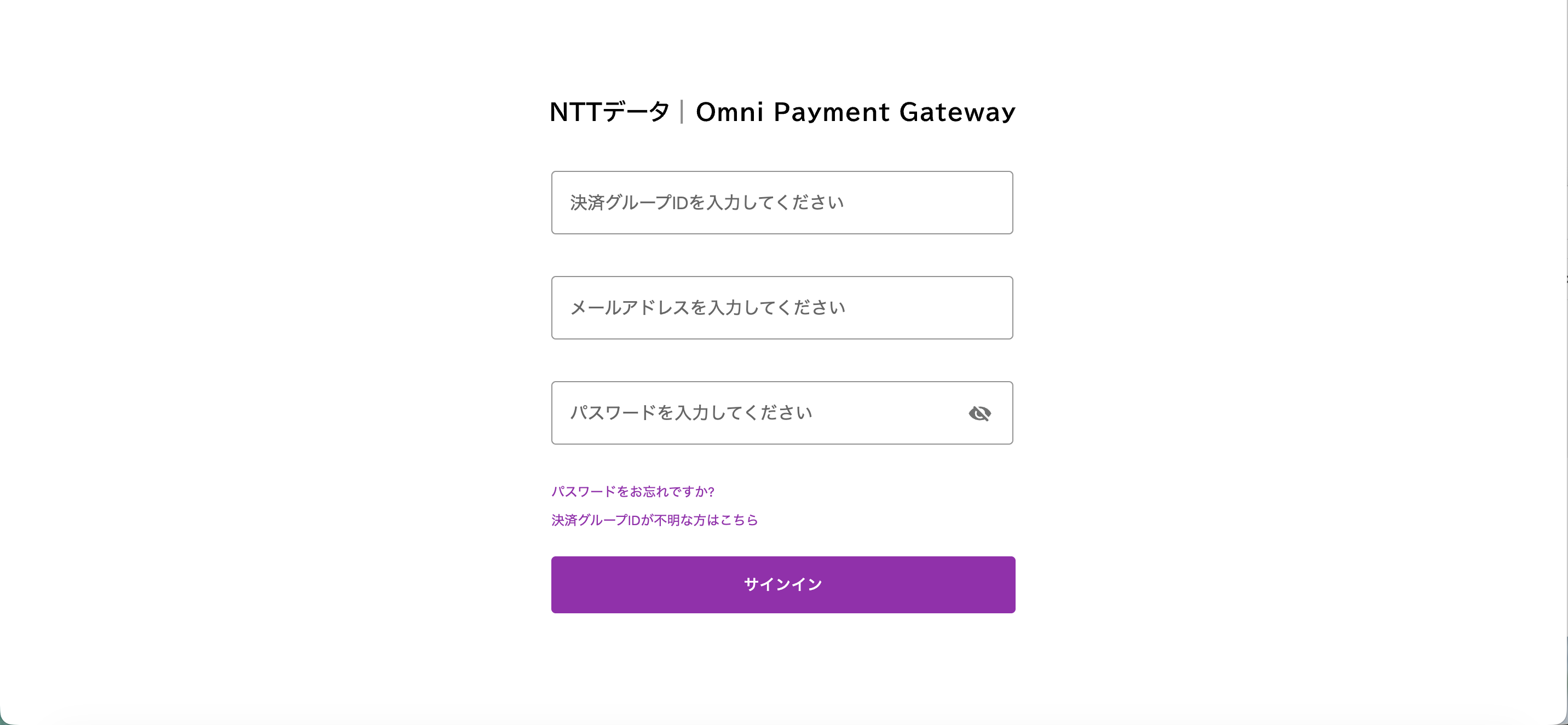 PAYGENT管理画面にアクセスし、決済グループID、メールアドレス、パスワードを入力してログインします。