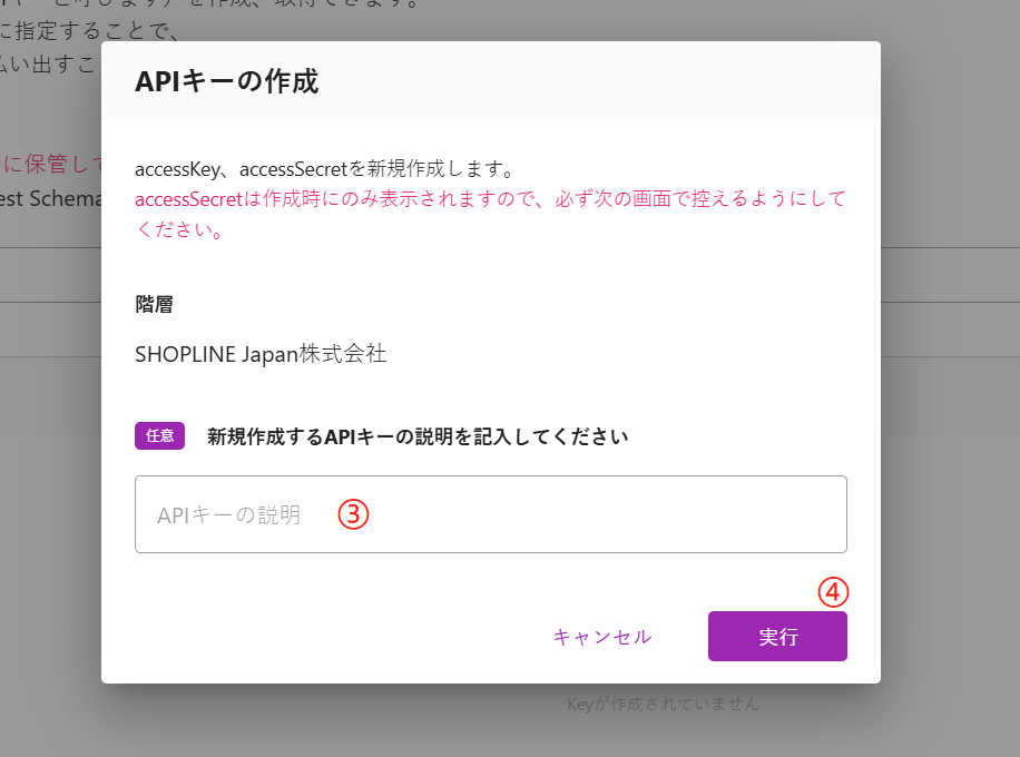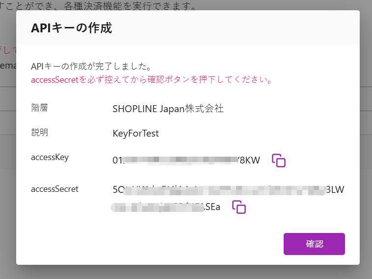 ヒント: accessSecret は生成時に一度しか表示されません。後から再確認することはできないため、表示された情報は必ず安全な場所に保管してください。 |
