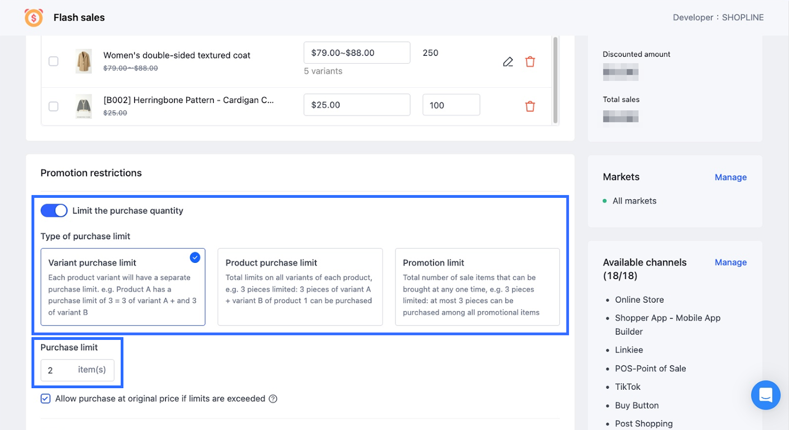 - チェックアウト時に、システムはタイムセールの購入制限を適用します。タイムセールの制限内の数量のみがチェックアウトに含まれます。
