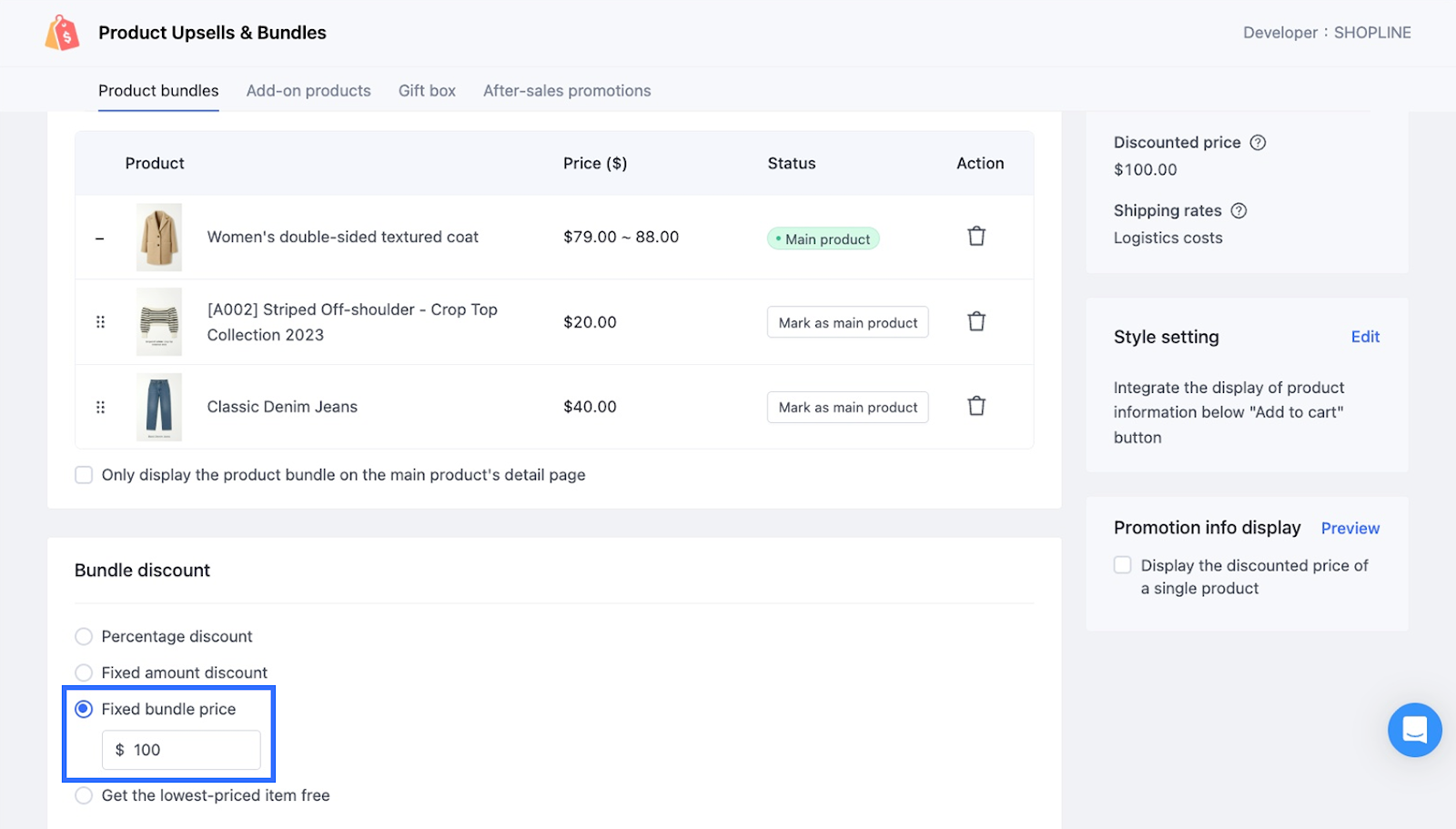 固定バンドル価格割引を設定する際は、指定した金額がバンドル内のすべての商品(設定時の通常販売価格に基づく)の合計最低価格よりも低くなければなりません。