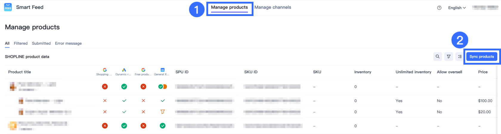 Smart Feed (New) で、商品管理 > 商品を同期に移動します。