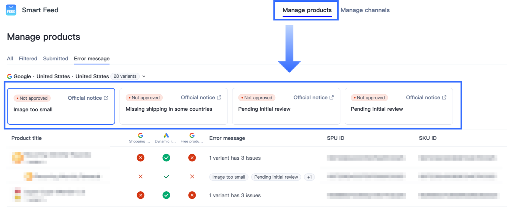 - エラータイプで商品をフィルタリングし、一括で問題を修正する