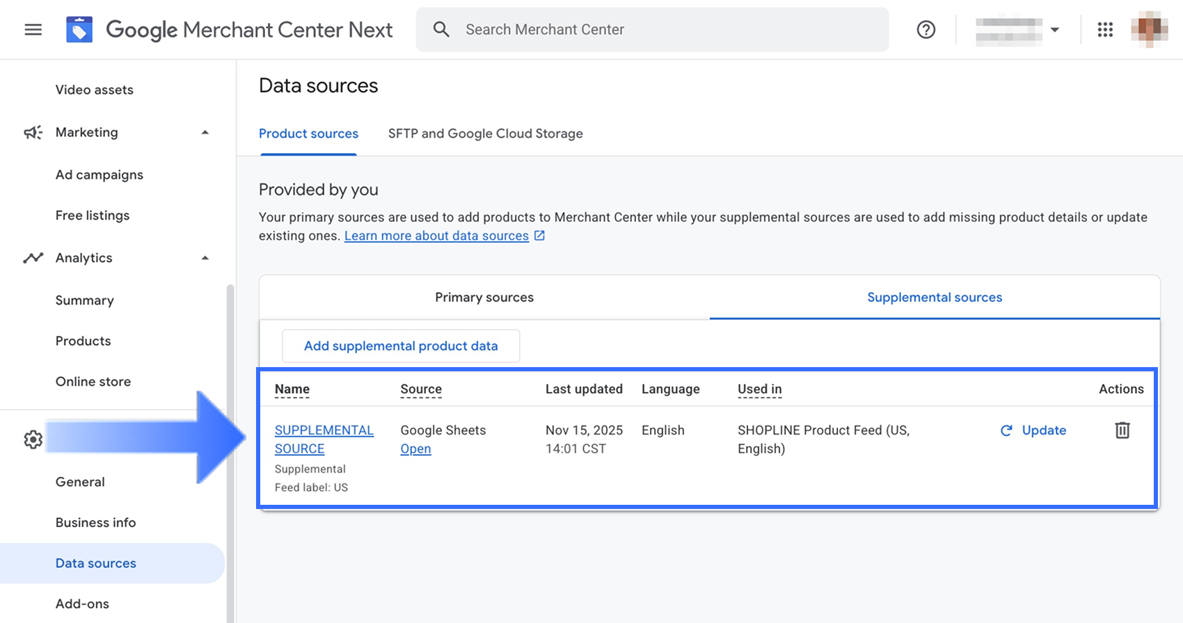 マルチクライアントアカウント(MCA)やサブアカウントでは、アカウント構造の異なるレベルで補足データソースを作成できます。各補足ソースが正しいプライマリーデータソース(同じ国/言語ターゲット)にリンクされていることを確認し、更新が適切に適用されるようにしてください。詳細については、Googleのガイド「マルチクライアントアカウントの補足商品データソースの設定」を参照してください。