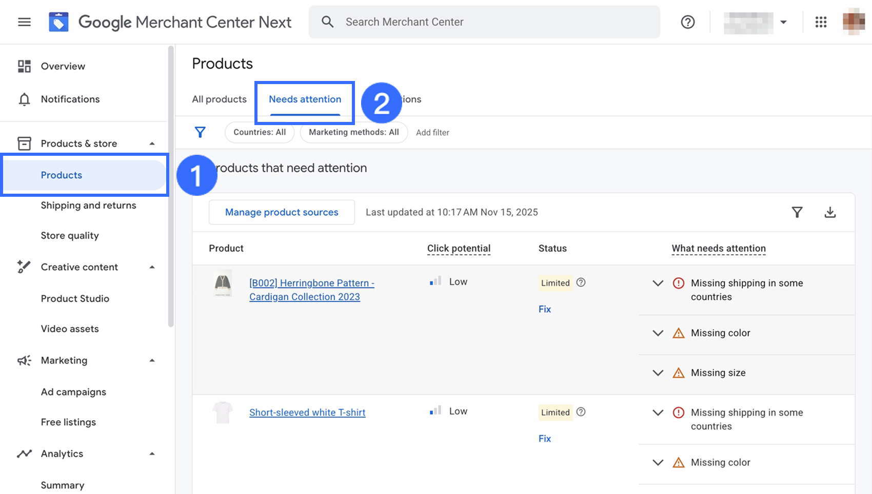 最初のアップロードまたは取得後、Merchant Centerの商品 > 注意が必要でエラーがないか確認します。
