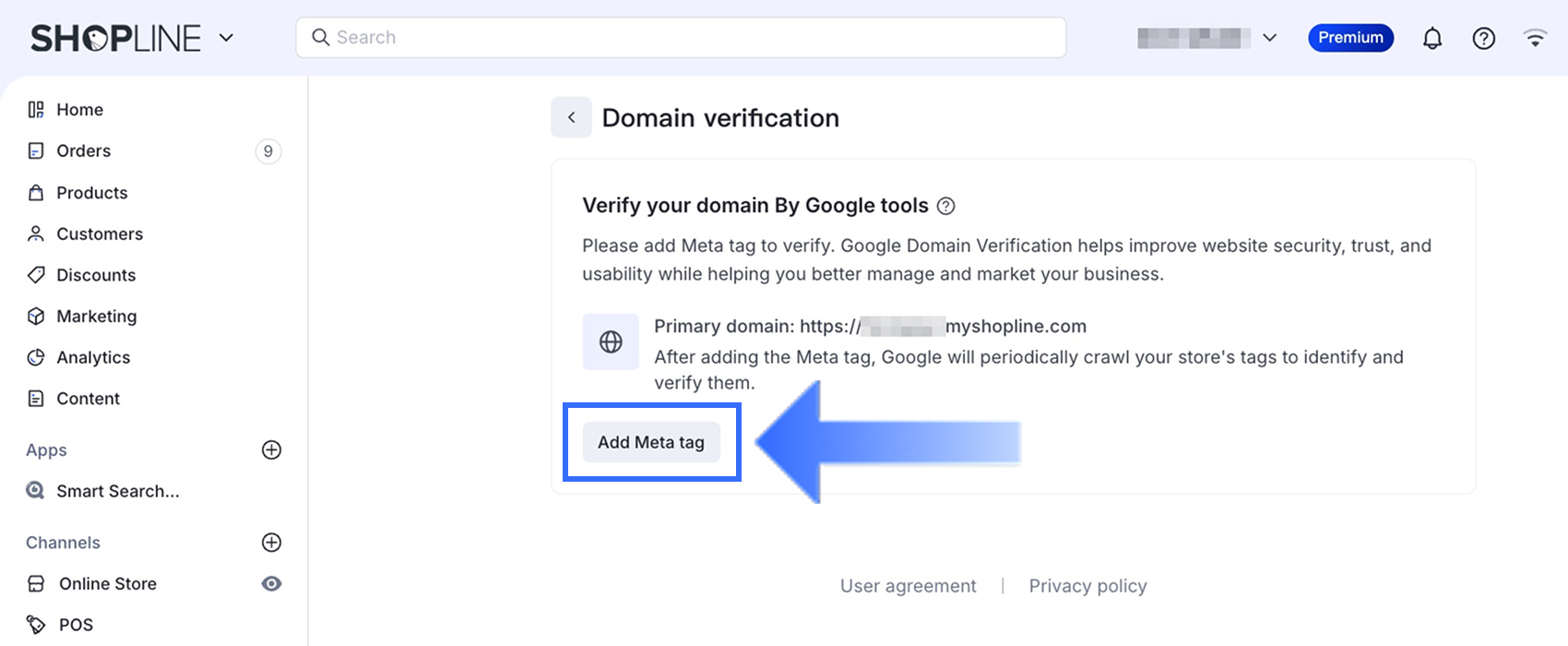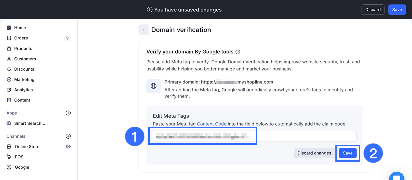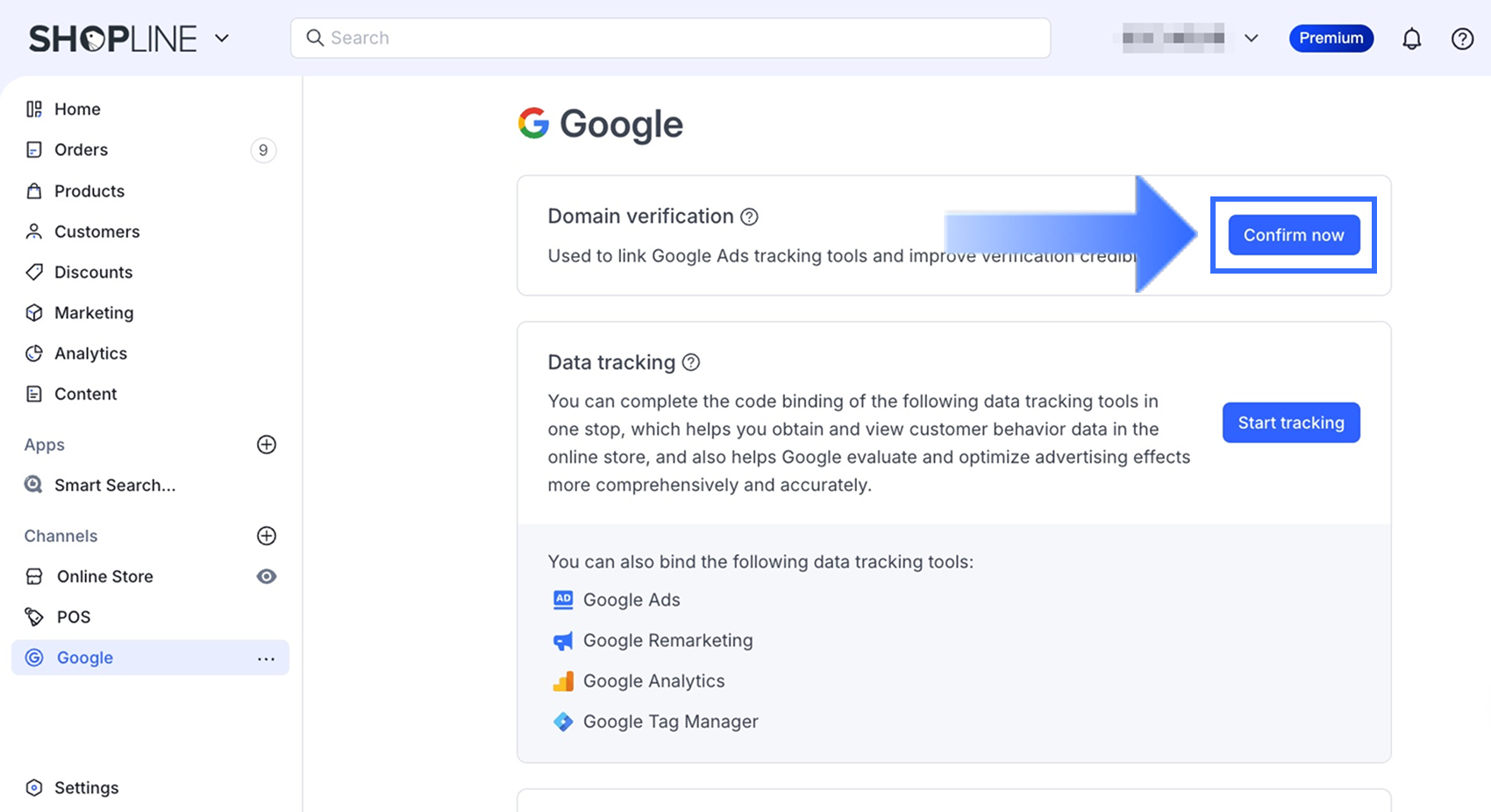 SHOPLINE管理画面で、チャネル > Googleに移動します。ドメイン検証セクションで、今すぐ確認をクリックします。