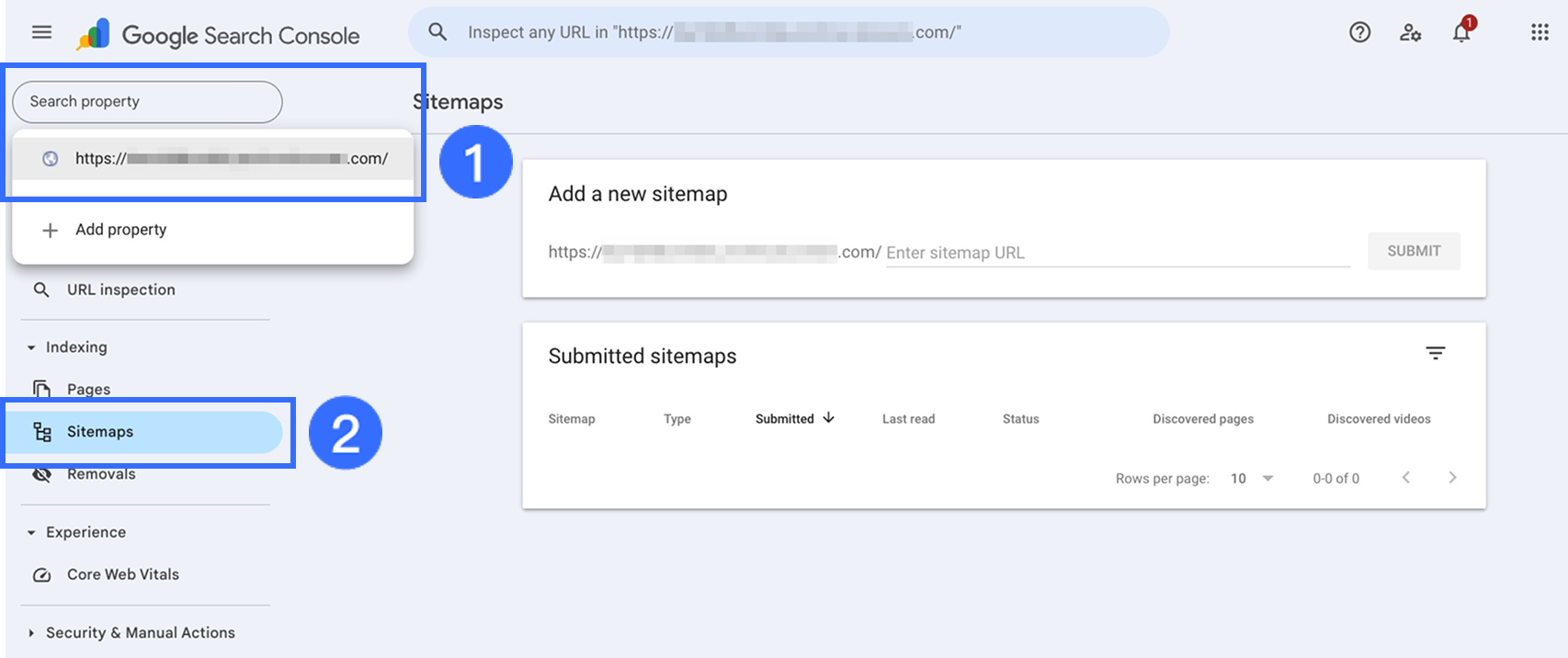 Google Search Consoleで、左上のドロップダウンからあなたのサイトを選択し、サイトマップセクションに移動します。