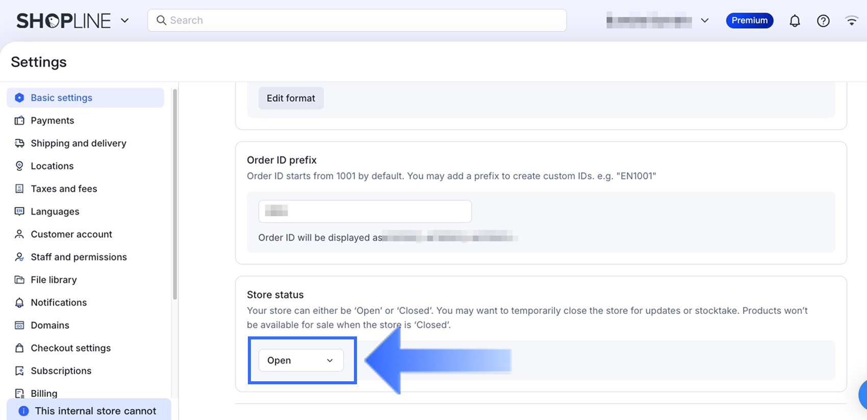 Metaタグを追加した後、設定 > 基本設定 > ストアステータスに移動し、ストアのステータスが公開中であることを確認します。Googleがストアフロントにアクセスできる必要があります。