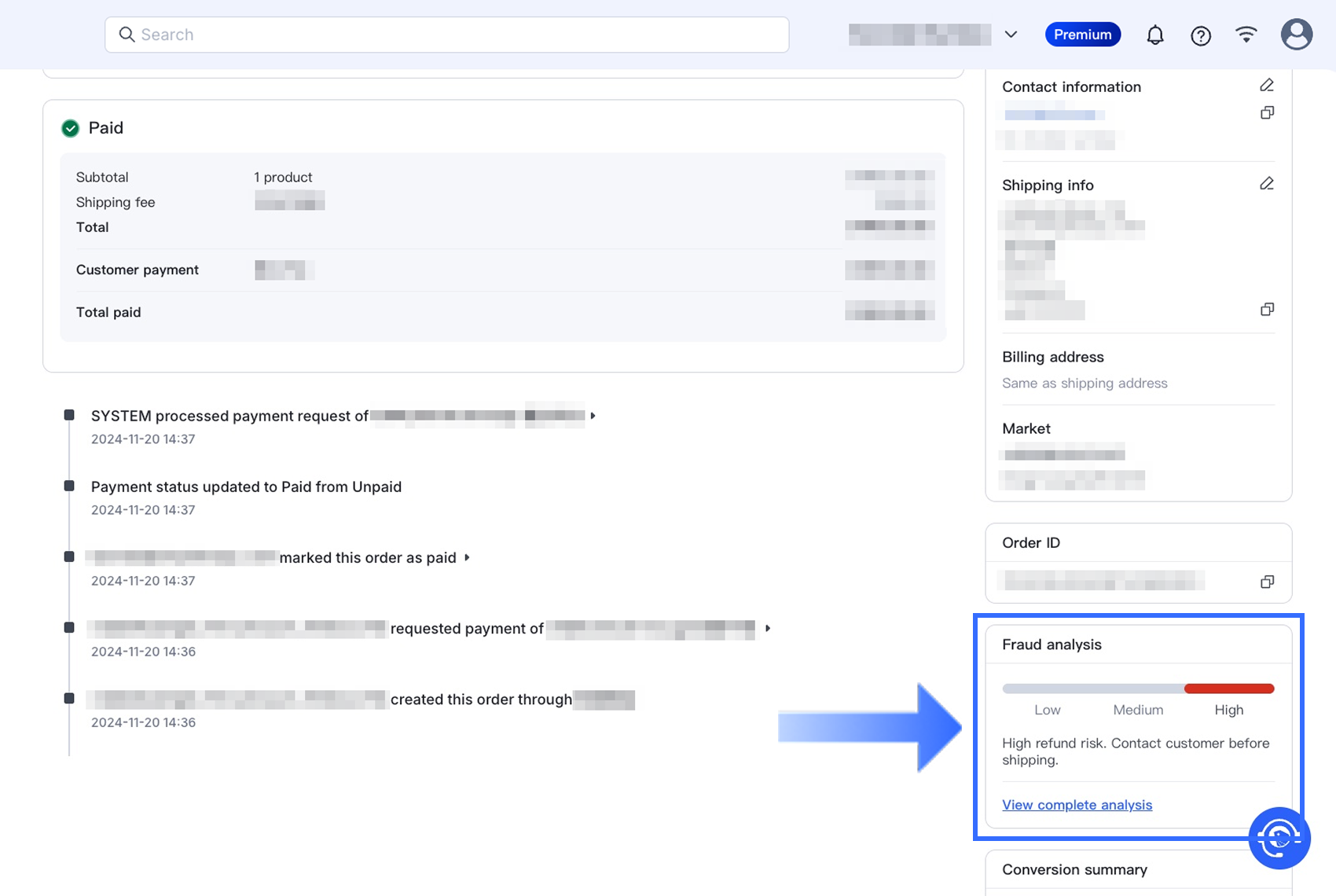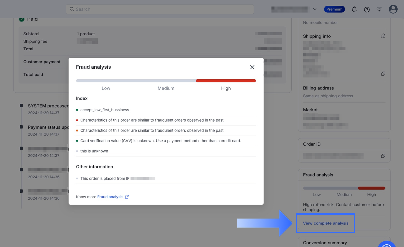 Dựa trên đánh giá các chỉ số gian lận, SHOPLINE cung cấp mức độ rủi ro cho đơn hàng. Nhấp vào Xem phân tích đầy đủ để xem thông tin chi tiết.